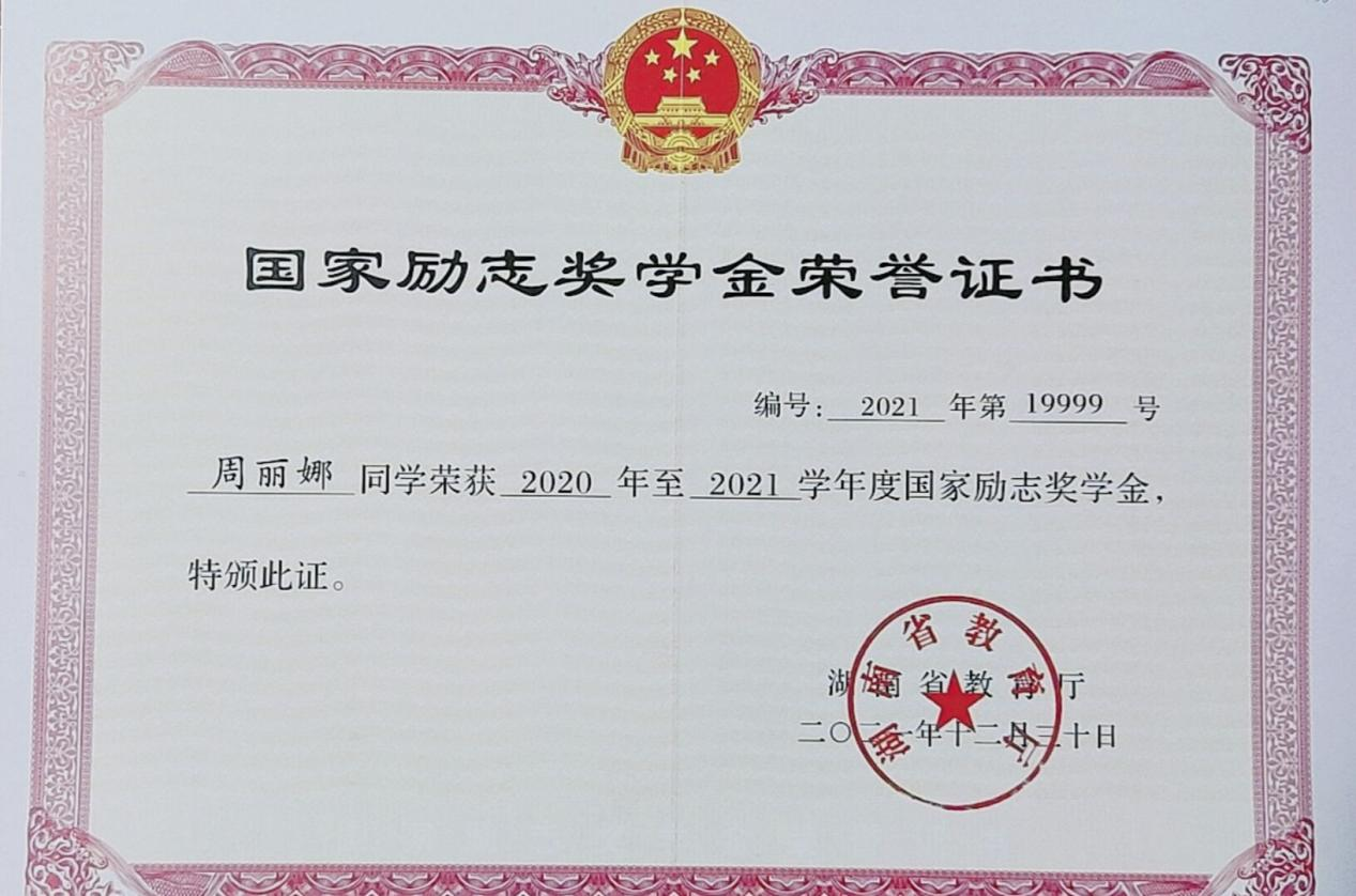 ▲周丽娜荣获国家励志奖学金荣誉证书