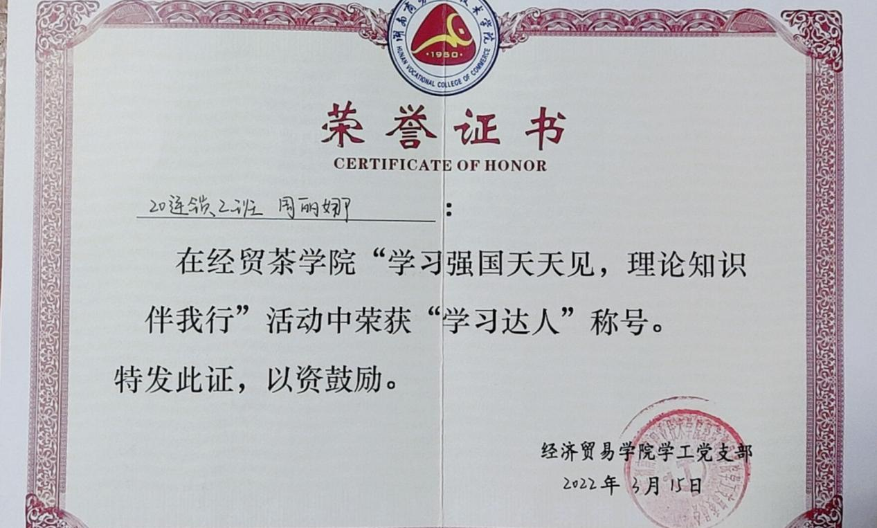 ▲周丽娜荣获“学习达人”称号荣誉证书