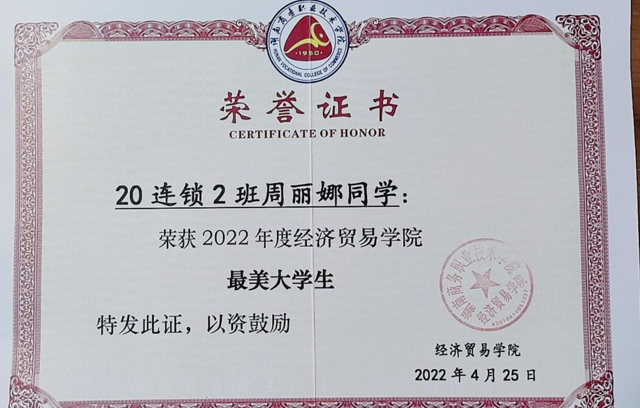 ▲周丽娜荣获“最美大学生”称号荣誉证书