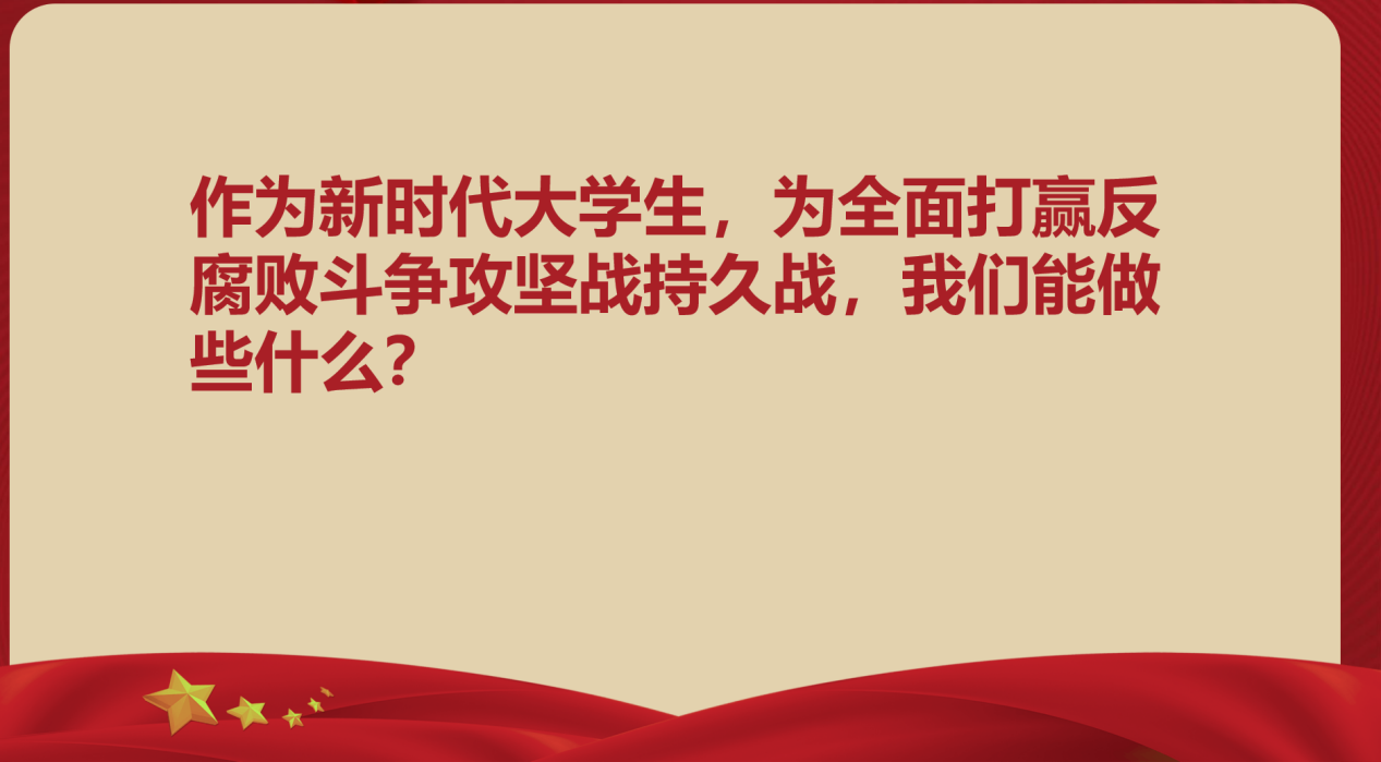 接着,主持人组织学习了习近平总书记在中共中央政治局第四十次集体学习时的重要讲话精神。随后,集中观看学习视频中纪委反腐大片《零容忍》。观看结束后,会议以“作为当代大学生,为全面打赢反腐败斗争攻坚战持久战,我们能做些什么”这一话题组织大家进行讨论。大家踊跃分享自己的看法。主持人彭嘉钰同志率先进行分享:“我认为,作为一名大学生,现阶段我们首要是做好自己,提高自身政治素养是当务之急。廉洁修身是我们的使命,树立正确的三观和筑牢理想信念之魂,才能经得住各种考验。”