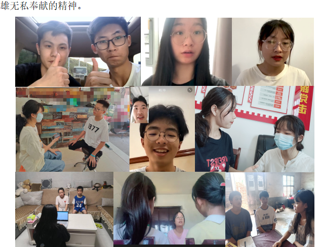 活动前期,同学们将所宣讲的疫情期间先进人物的事迹进行整理,以线上视频会议和线下面对面交流相结合的形式对宣讲的内容进行打磨。活动过程中,同学们向邻居、朋友讲述着英雄们“战疫”背后的故事。工作中的“战斗机”刘卡卡同志、天使化作“战士”张海云同志、一线抗“疫”王国苹同志、复工战“疫”黄勇军同志……宣讲员们用乡音讲抗疫故事,让党的声音扎根群众心坎。在宣讲时,一位二十出头的青年听众有感而发:“平凡的岗位,不平凡的人生,他们虽然不像钟南山等院士一样,做出很大的贡献,但在我看来,依然伟大,英雄非他们莫属。”此外,同学们还积极向乡亲们宣传疫情防控知识,提倡人人做好防护,共建美好家园。一位老爷爷听完宣讲后说到:“在此前觉得疫情离我们小镇很遥远。听完你们年轻人的宣讲后,我认为我们需始终保持高度警惕,筑牢疫情防控的家庭防线。”