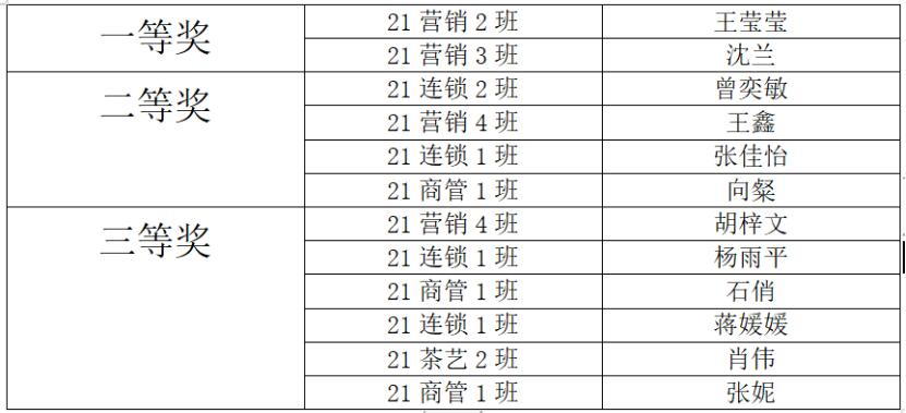 最终,21营销2班王莹莹、21营销3班沈兰等的12位同学在本次竞赛中表现优异,获得本次竞赛活动的一、二、三等奖。