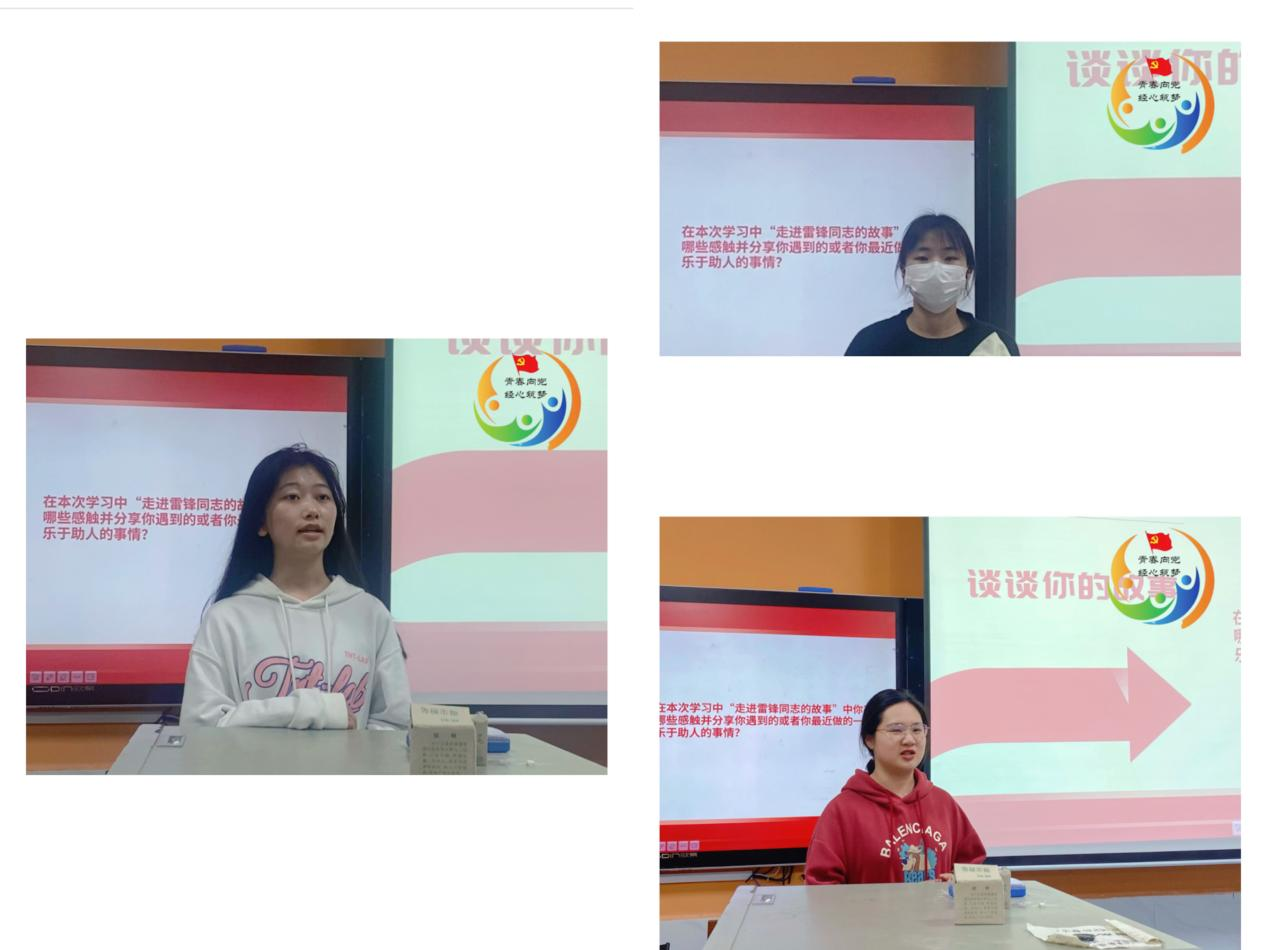 在最后,主持人与大家就“从雷锋同志的事迹中你学到了什么?”这一问题进行了讨论。入党积极分子王莹莹说:“在我小时候,我家那边的治安还不是特别好,当时的有挺多的社会闲杂人等,时常会发生欺负弱小的事情。那时我也很小,不敢与他们作斗争,但如今我长大了,也从很多的榜样身上学习到了很多,我相信如果我再遇到相关的事情,我会积极地向这种不良风气作斗争,向雷锋同志一样舍己为人,向他们伸出援助之手。”