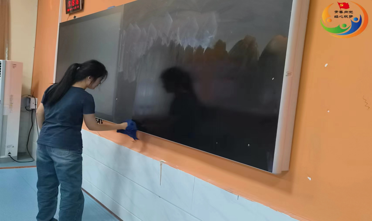 ▲22级市场营销2班王茹同学正在认真擦拭黑板