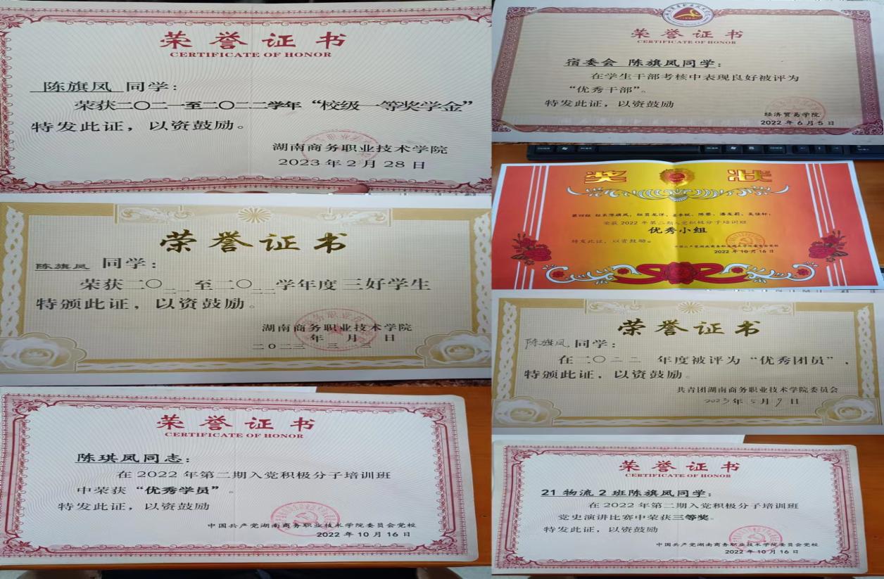 (通讯员 张宝贵)陈旗凤,女,汉族,2003年10月出生,共青团员,湖南商务职业技术学院21级物流管理2班学生,现为经济贸易学院第三期“青春向党”先锋营成员。在校期间,陈旗凤认真努力,荣获2021-2022学年校级一等奖学金、“优秀团员”荣誉称号、“三好学生”荣誉称号、“优秀学生干部”荣誉称号。在2022年第二期入党积极分子培训班荣获“优秀学员”,在2022年第二期入党积极分子培训班党史演讲比赛中荣获三等奖。“生命对我们来说都只有一次,在它正旺盛的时候,尽其所能发光发热,才更符合生命的自然。”这是陈旗凤关于奋斗的解读。