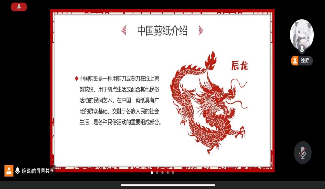 随后,主持人就“中国剪纸的介绍”“中国剪纸的历史”“中国剪纸的派系”“中国剪纸的其他”这四个方面带领同学们一起去探寻剪纸艺术的神奇之处。在学习过程中,同学们了解到中国剪纸具有深厚的文化内涵和广泛的社会影响。在中国的乡村和城市,无论是重大节日还是日常生活,都可以见到剪纸的身影。它们被贴在窗户、墙壁、门楣上,以色彩斑斓的图案装点着人们的生活,给人带来无尽的审美享受。同时,剪纸也是许多民俗活动的重要组成部分,如婚礼、生日、祭祀等,常以剪纸作为表达祝福和心愿的方式。