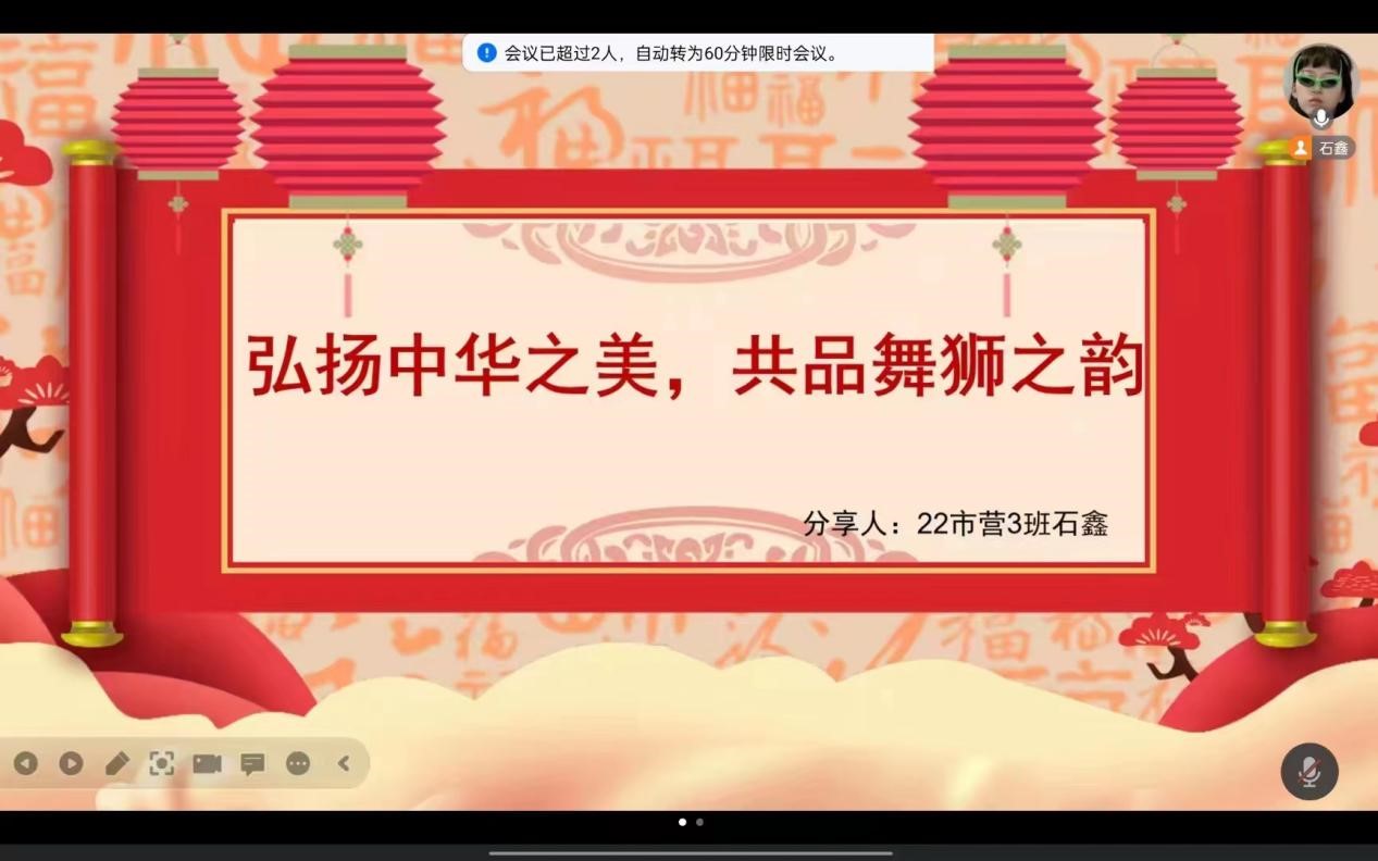 (通讯员 石鑫)2024年2月2日晚7时,经济贸易学院学工党支部以线上会议 (腾讯会议)的形式组织开展“弘扬中华之美,共品舞狮之韵”主题党日活动,此次活动由第四期“青春向党”先锋营入党积极分子石鑫同学主持,经济贸易学院学工党支部全体党员、入党积极分子参加此次活动。