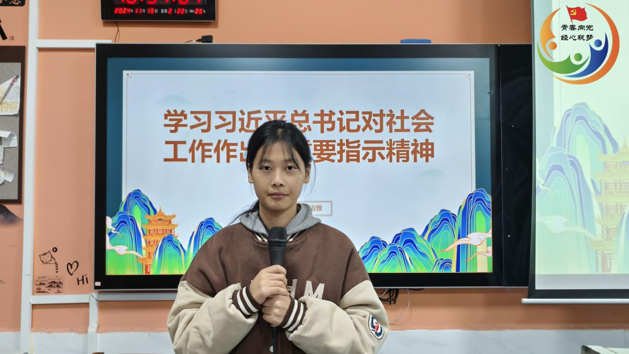 (通讯员 高静怡)2024年11月19日晚7时,经济贸易学院学工党支部在博思楼101教室(经济贸易学院分党校)组织进行“学重要精神,担青年使命”主题党日活动,集中学习近日习近平总书记对社会工作作出的重要指示精神。此次活动由入党积极分子23级物流管理2班彭淑雅主持,经济贸易学院学工党支部全体党员、入党积极分子参加此次活动。