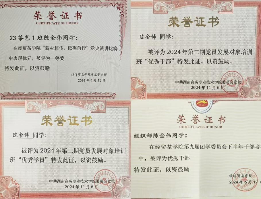 2023年陈金伟退役复学,经常给予他关怀的助理辅导员何叶子说过一句话令他记忆犹新:“在为人民服务中牢记宗旨和遇到困难冲在最前的初心,我为什么入党,那就是因为‘特权’,是可以冲锋在前的‘特权’,当我的国家和人民遇到困难时,我是可以冲在最前面的人!”她的一席话让陈金伟对担当有了更加深刻的感受,在努力学习的同时,他也会积极参加各种竞赛培养自己的综合能力。