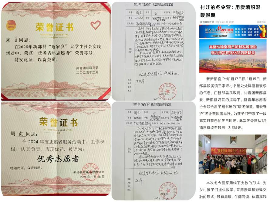 这个暖冬,周贞同学留下了很多印记,有她跟随组织宣传安全教育的身影;有她在夜幕降临时,伏案备课的灯光;还有她在望向孤独老人时,眼眶边用处的泪水。她的付出与坚持,最终也收获了认可,她被相关组织单位评为了“优秀志愿者”和“优秀青年志愿者”,这些荣誉不仅是对她过往努力的肯定,更是对她未来旅程的激励。