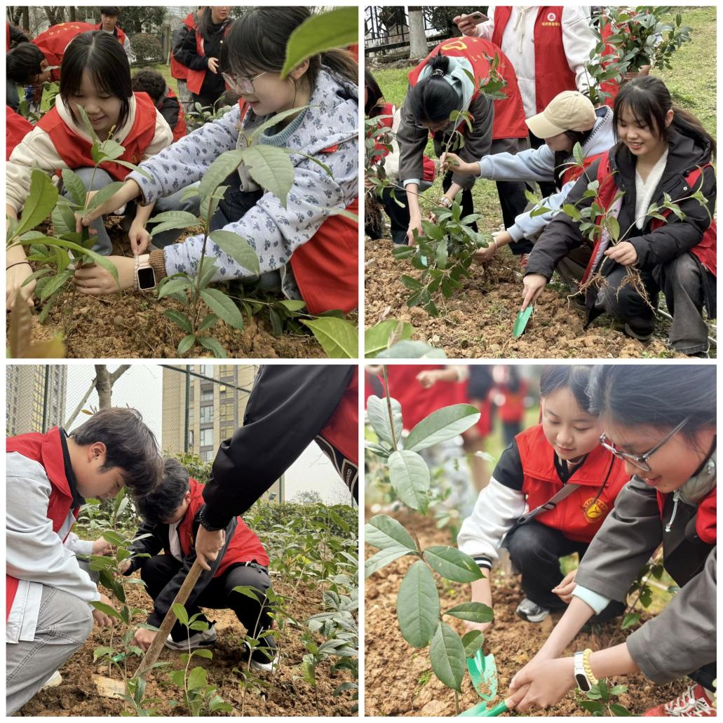在众人齐心协力之下,一株株新植的幼苗整齐排列,昂扬挺立,在春风中迸发出勃勃生机。随后,志愿者们又细心地拔除了树苗周边的杂草。随着时间的流逝,树苗圃处处洋溢着蓬勃的活力与生机,满是春日独有的明媚与希望。确保所有的工作都一丝不苟地完成后,志愿者们围绕20株小黄杨和30株小桂花,定格了春天的大爱心合影——青春的“志愿红”守护希望的“生态绿”。