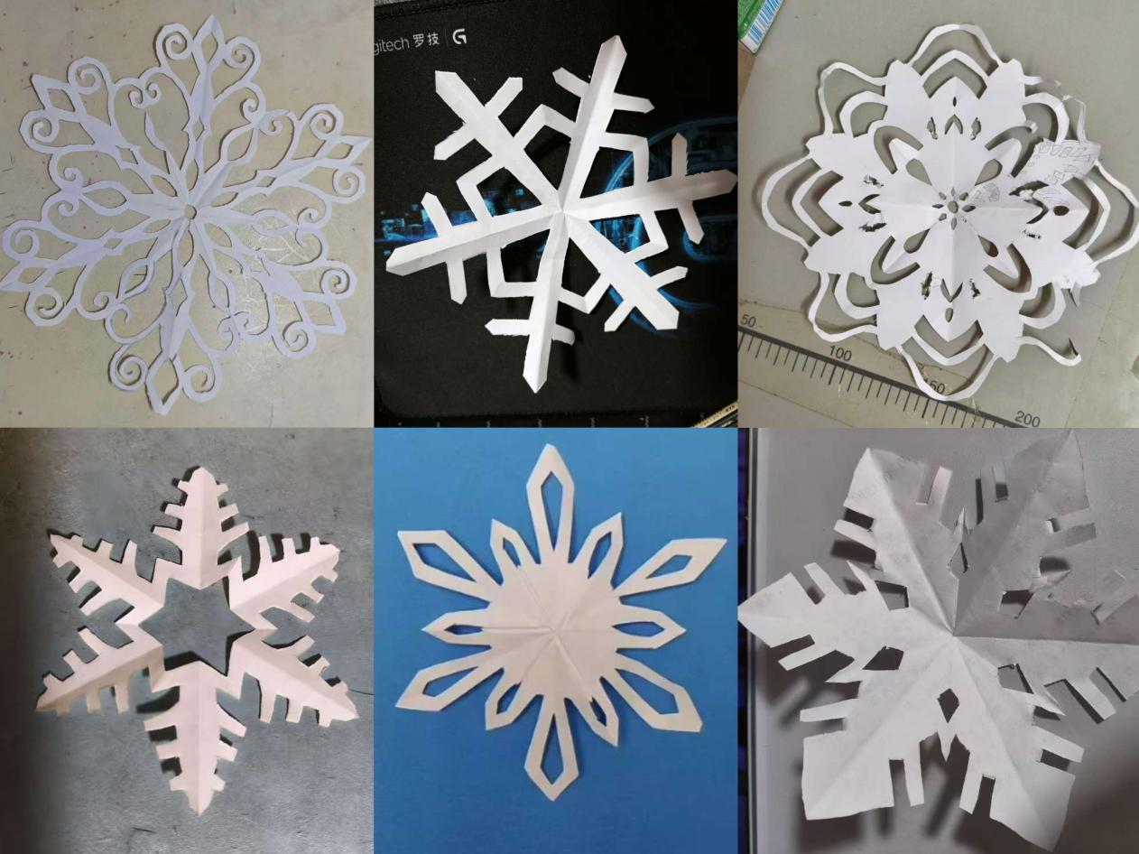 在剪纸环节中,同学们以折、剪、刻、裁等传统技法,创作出各具巧思的雪花作品。纹样或对称精巧,或灵动别致,片片雪花在指尖绽放,既锻炼了动手能力,更深化了对传统技艺的理解与传承。