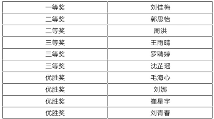 经评委评分决定,本次比赛共有13位同学入围决赛,决赛采用网上投票方式,最终恭喜以下10名同学获奖。