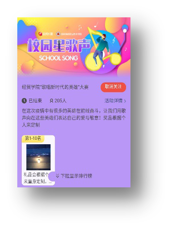 本次活动采取线上录制模式,18、19级各班文娱委员下发通知至班级并收集报名者名单,参与者统一下载“全民K歌”软件并加入“湖南商务职业技术学院”家族发布一首本人翻唱的青春正能量歌曲,后续同时进行为期14天的投票活动。