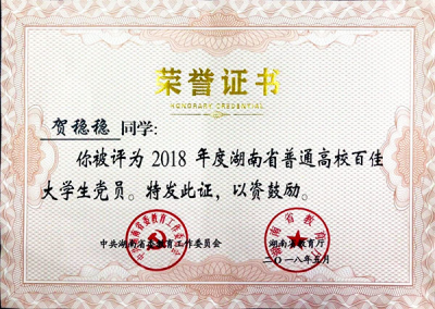 贺稳稳同学获评“湖南省普通高校百佳大学生党员”称号