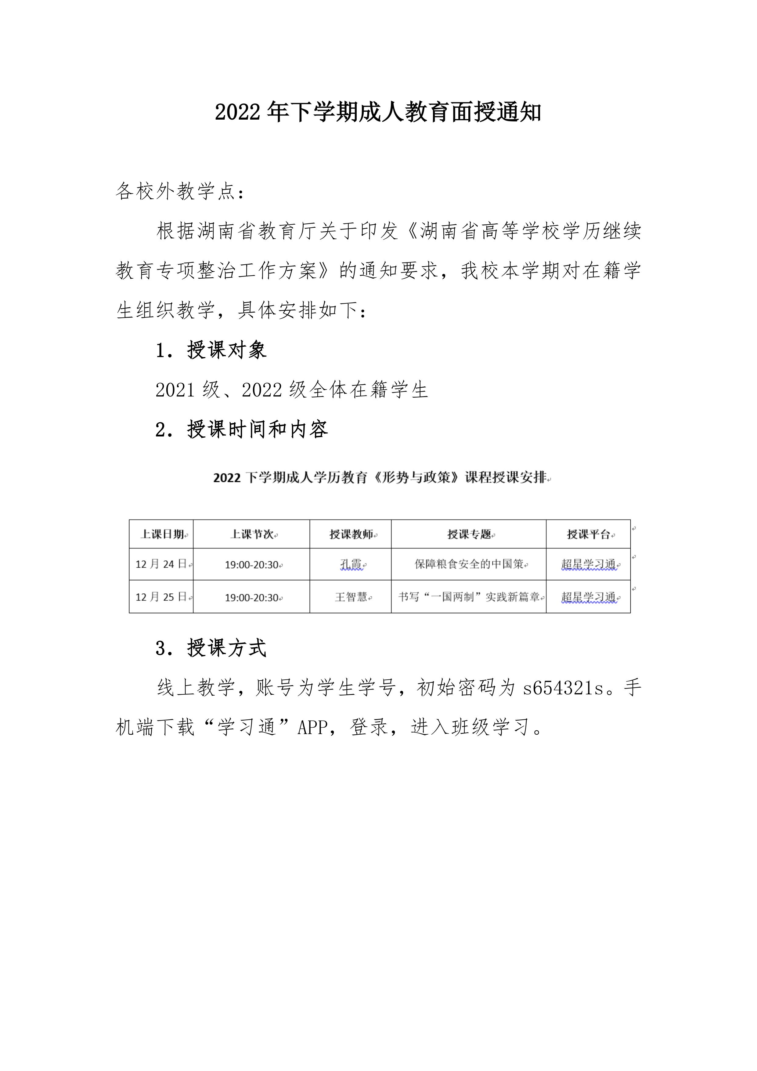 2022年下学期成人教育面授通知