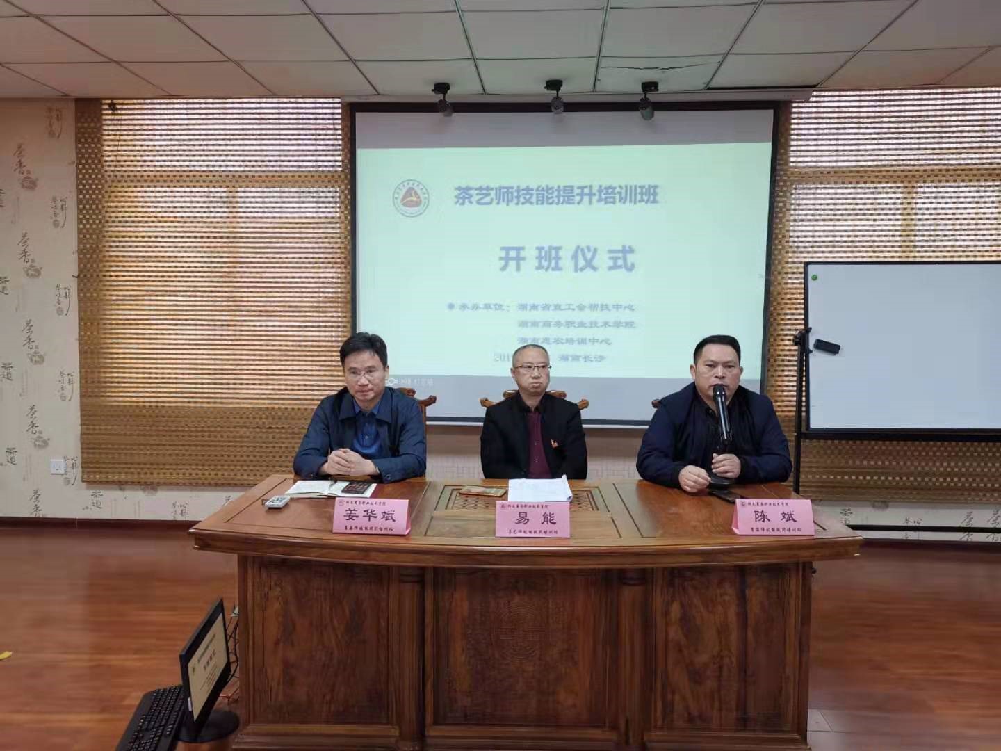 为了弘扬湘茶文化,助力乡村振兴,助力湖南“千亿茶产业”目标实现,提升从事茶叶工作劳动技能,提高从业人员收入,在湖南省工会和学校领导支持下,湘茶学院联合继续教育学院共同承办了茶艺师技能提升培训班,2019年11月1日开班仪式在学院办公楼五楼茶艺室举行。湘茶学院院长易能、继续教育学院院长姜华斌、副院长陈斌参加了开班仪式。