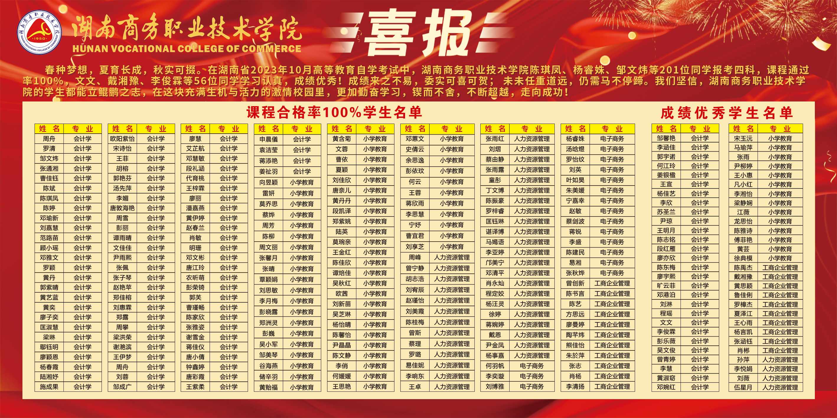 星光不问赶路人,岁月不负有心人。2023年10月份高等教育自学考试成绩于2023年12月2日公布,我校学子不负众望,成绩可喜、再创佳绩。其中陈琪凤、杨睿姝、邹文炜、梁洪荣、陈馨怡等201名同学通过率达到100%,文文、戴湘豫、李俊霖、宋玉沅、尹琼等56名同学通过率达到75%以上。继续教育学院现将自考本科班取得优异成绩的同学张榜公布,对他们进行表彰!