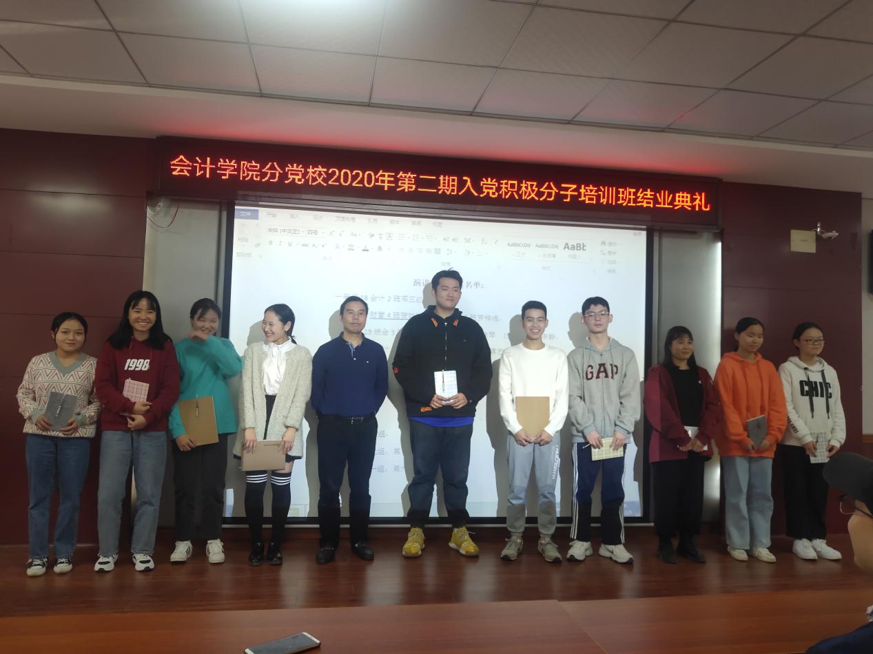 2020年11月5日中午12:30整,在二教201举行了中共湖南商务职业技术学院会计学院分党校2020第二期入党积极分子结业典礼。出席本次典礼的老师有会计学院党总支书记黄铖、学工一党支部书记朱泳霖以及全体第二期入党积极分子,本次典礼由黄姗姗主持。