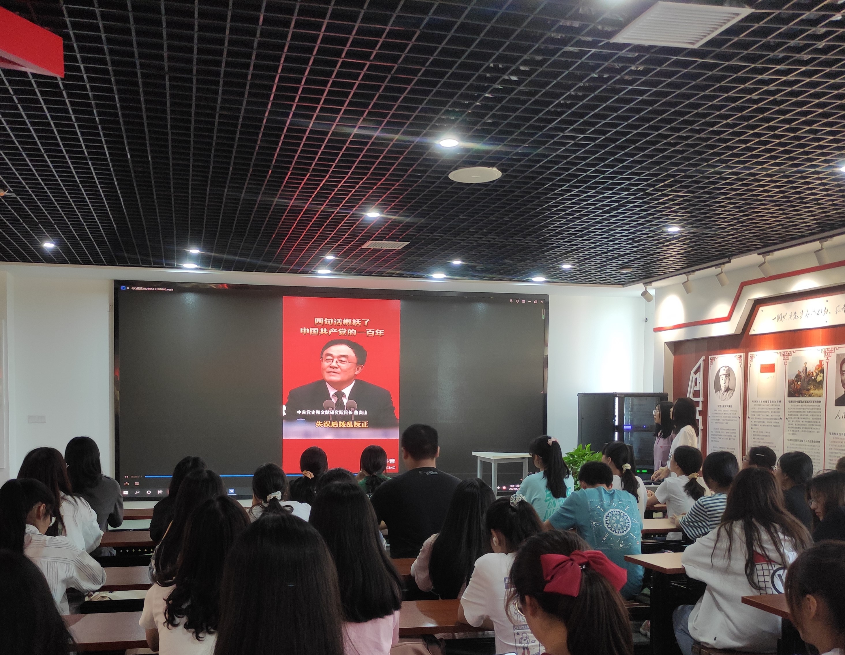 环节二,集体学习观看视频《四句话概括中国共产党的一百年》《听爷爷说长坪山的故事》,在视频中去学习党的成立,党的发展,党的日渐完善,使同学们了解我们的党一路走来的艰辛和坚定,让同学们明白自己的时代使命和责任。