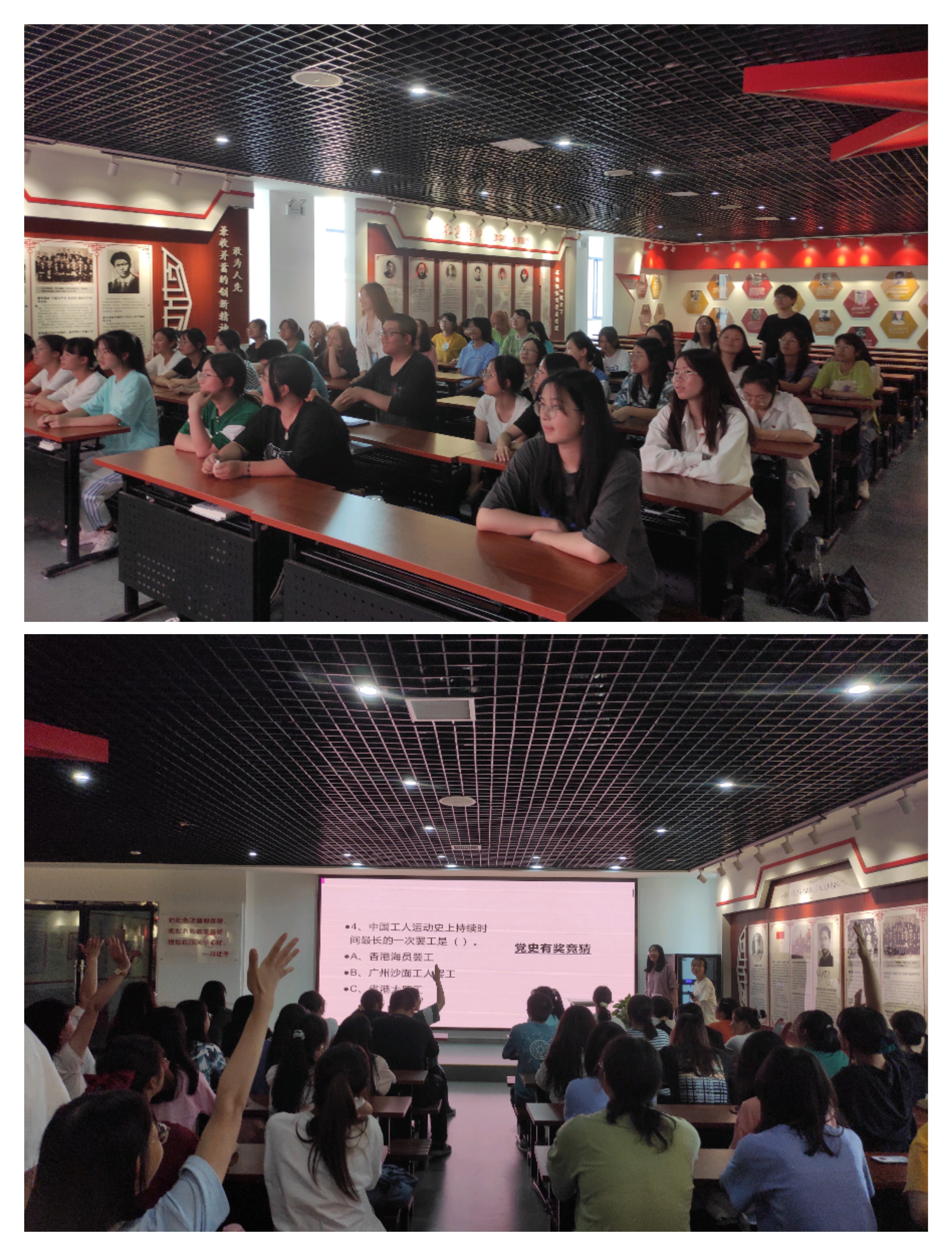 环节四,举行了党史有奖竞猜活动,同学们平时利用课余时间在学习强国上学习党史,现在到了检验的时候。竞赛中同学们积极举手发言,气氛活跃,可见平时大家学习得很认真,也促进了大家相互学习。