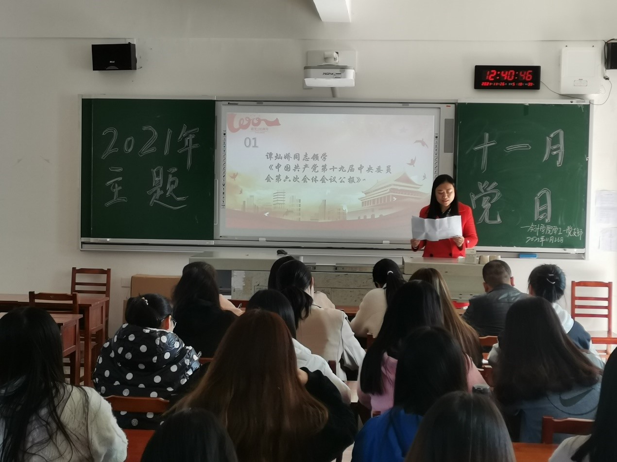 活动伊始,支部书记谭灿娇同志领学《中国共产党第十九届中央委员会第六次会体会议公报》,她强调,我们要积极响应党中央号召,要全面贯彻以习近平新时代中国特色社会主义思想,大力弘扬建党精神,必须永远保持同人民群众的血肉联系,践行以人民为中心的发展思想。
