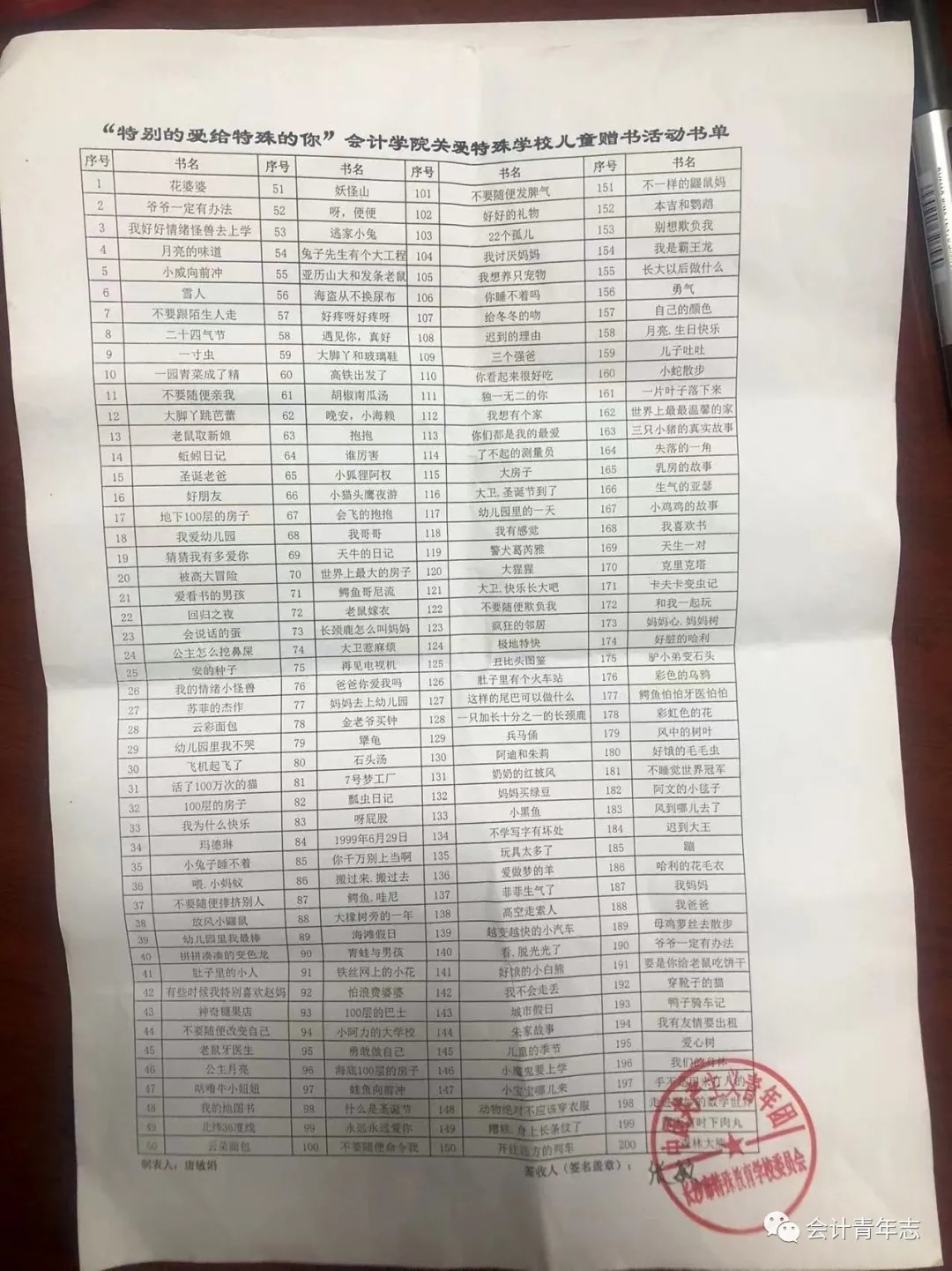 本次志愿活动不仅为特殊教育学校的孩子们送去一份冬日温暖,还加深了大家对“志愿服务”的理解和感悟,增强志愿团队的服务意识。今后,我院将继续秉承志愿服务精神,开展系列公益爱心活动,主动承担社会责任,进一步弘扬服务精神。附:会计学院关爱特殊学校儿童捐赠书单