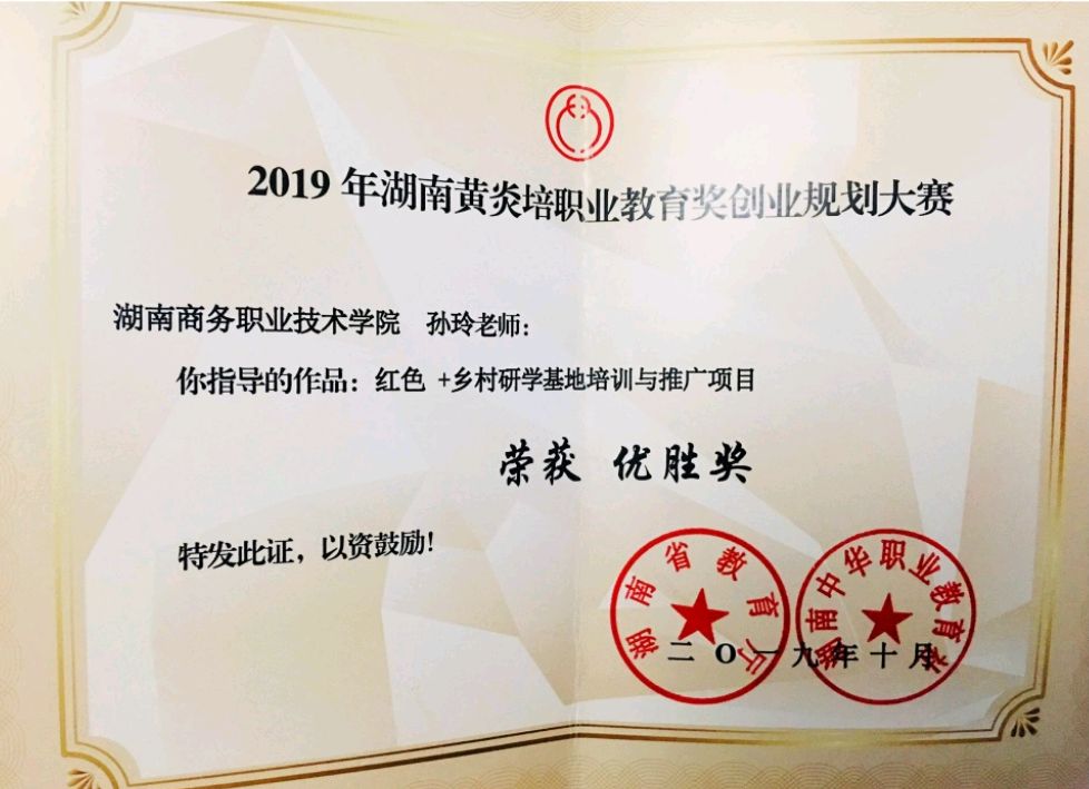 2019年10月, 由我院学生刘昕、谭文彪、王卓、陈明、刘艳组成的参赛团队在指导老师孙玲的带领下,凭借参赛作品—红色+乡村研学基地培训与推广项目,在2019年湖南黄炎培职业教育奖创业规划大赛中荣获优胜奖。