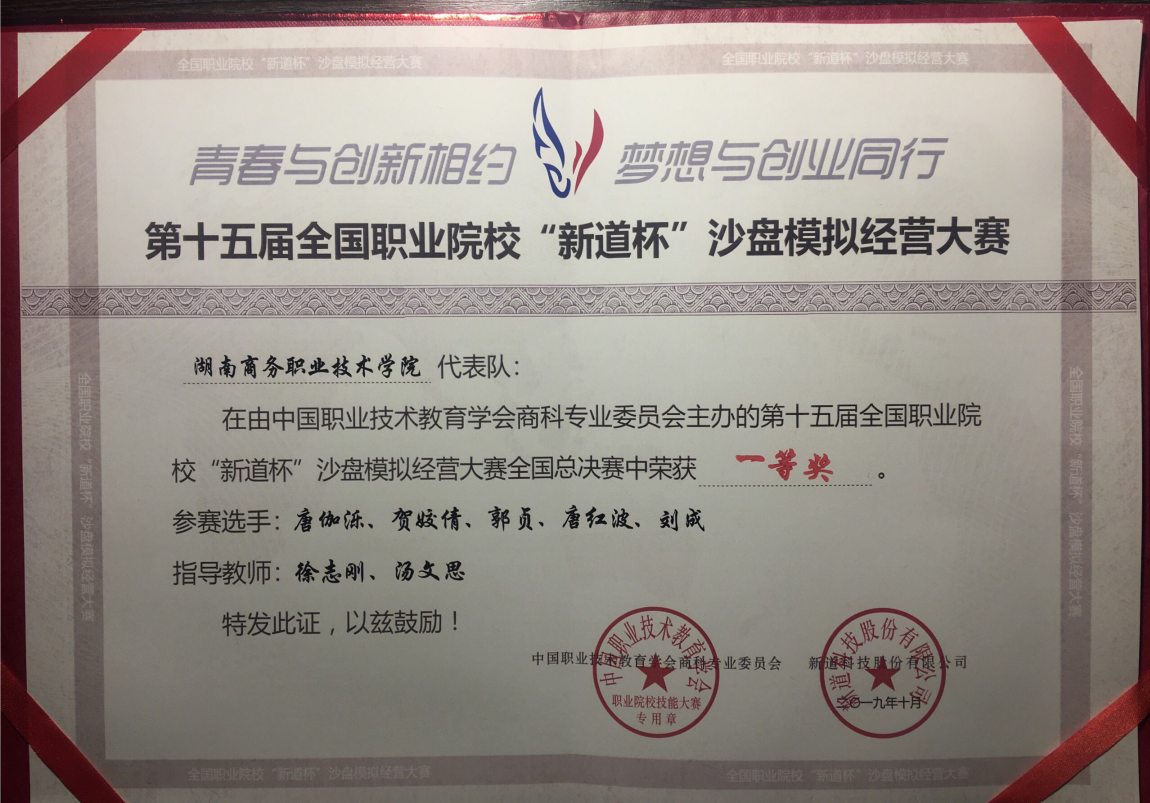 2019年10月, 由我校会计学院学生唐伽泺、贺姣倩、郭贞、唐红波、刘成组成的代表队,在指导老师徐志刚、汤文思的带领下,荣获了由中国职业技术教育学会商科专业委员会主办的第十五届全国职业院校“新道杯”沙盘模拟经营大赛全国总决赛“一等奖”。