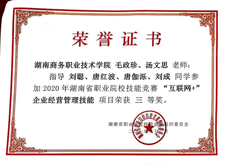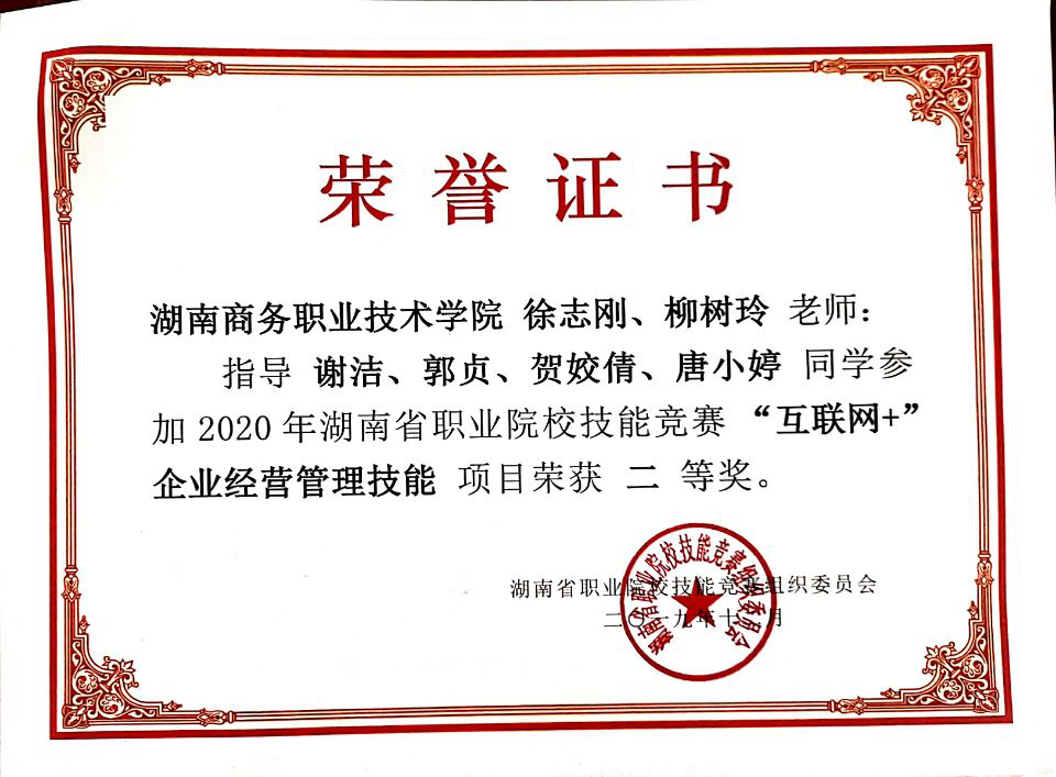 2019年12月,在2020年湖南省职业院校技能竞赛(互联网+企业经营管理技能)赛项中,我院共派出两队参赛,分别荣获了二等奖、三等奖。其中徐志刚、柳树玲老师指导的,由会计学院18会计9班唐小婷、18财管1班贺姣倩、18会计6班郭贞、18会计8班谢洁组成的参赛团队荣获二等奖;由毛政珍、汤文思老师指导的,由会计学院18财管4班唐伽泺、18会计8班刘聪、18会计10班唐红波、17财管1班刘成组成的参赛团队荣获三等奖。