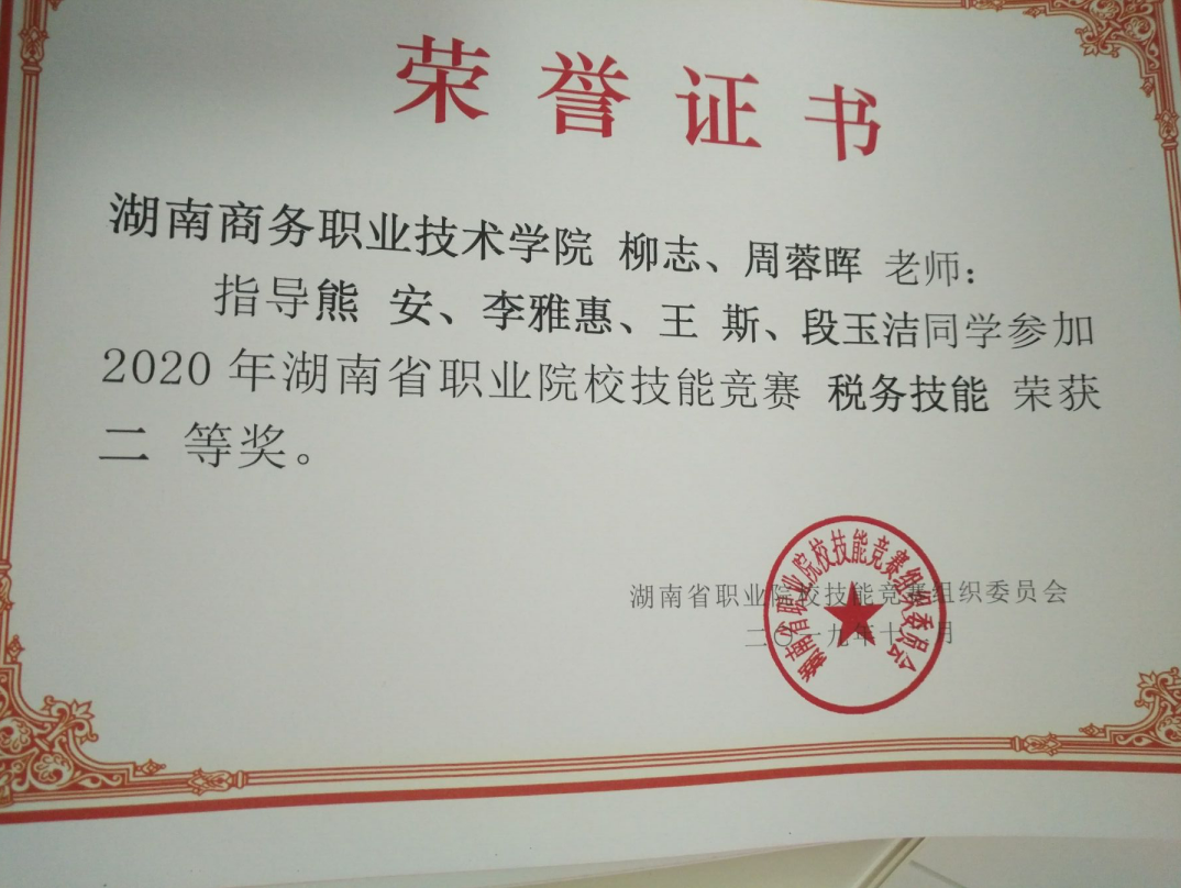 2019年12月,在2020年湖南省职业院校技能竞赛(税务技能)赛项中,我院共派出三队参赛,分别荣获了两个二等奖、一个三等奖。其中由周蓉晖、洪娟老师指导的,会计学院17会计1班谭建群、17会计1班任诗雨、17会计4班孙兵、17会计4班彭子惠组成的参赛团队荣获二等奖;由柳志、周蓉晖老师指导的,会计学院18会计3班王斯、18会计3班熊安、18会计1班段玉洁、18会计1班李雅惠组成的参赛团队荣获二等奖;由洪娟、陈佳钰老师指导的,会计学院18会计3班刘凤、18会计7班李珍、18会计9班徐景飞、17会计1班周便组成的参赛团队荣获三等奖。