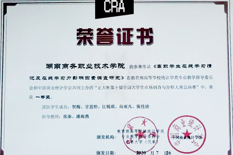 7月25-26日,由教育部高等学校统计学类专业教学指导委员会、中国商业统计学会共同主办,南京交通职业技术学院承办的“正大杯”第十届全国大学生市场调查与分析大赛专科组总决赛落下帷幕。经过激烈角逐,在全国各地118支参赛队伍中,由18级统计与会计核算专业贺梅、甘思怡、江锐琪、向雨凡、张佳欣5名同学组成的湖南商务职院代表队,在张秦老师和潘海燕老师共同指导下,获得了本次大赛专科组总决赛一等奖。