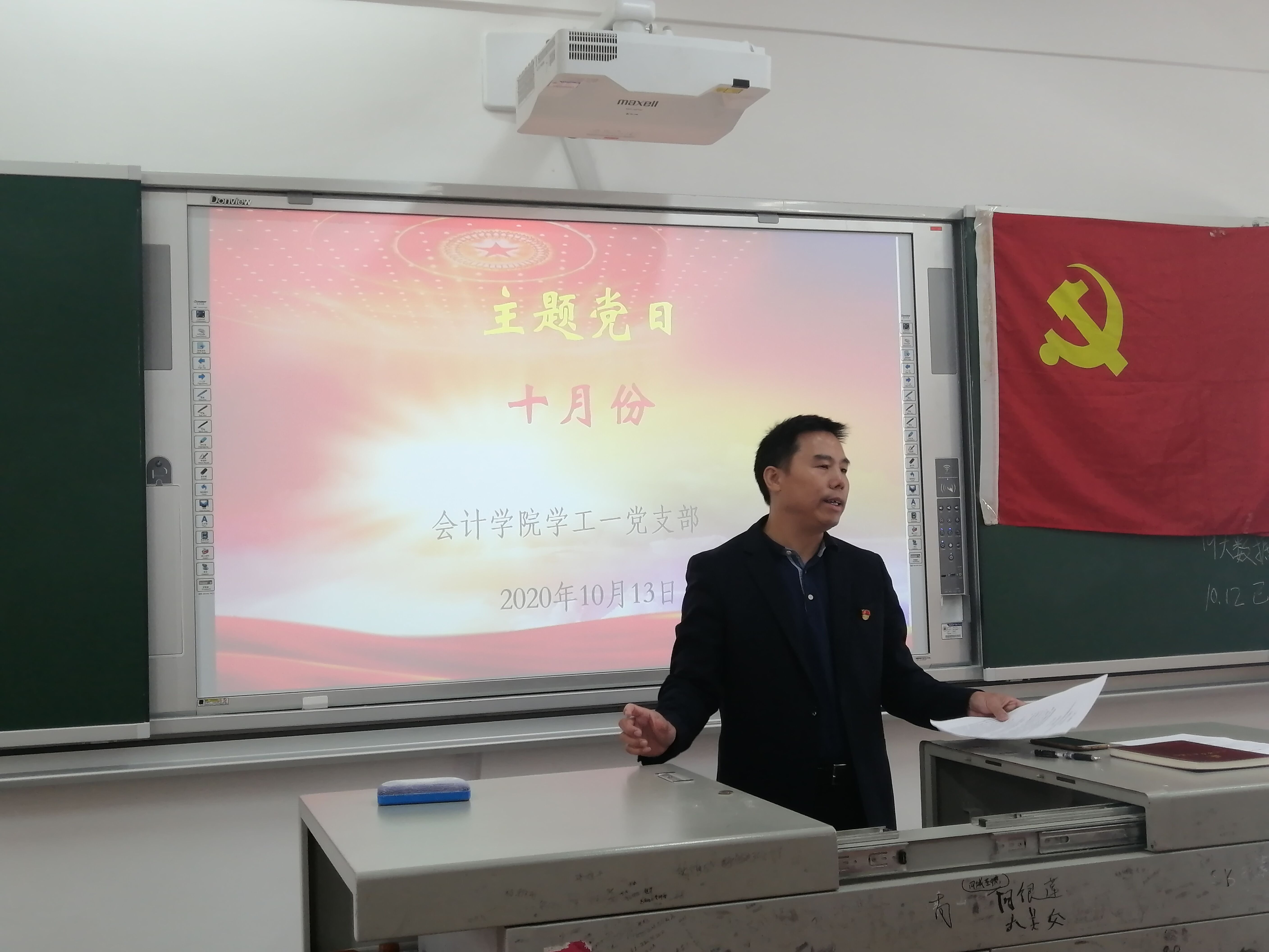为深入学习习近平新时代中国特色社会主义思想,加强革命传统教育,增强全体党员责任意识和爱国情怀,会计学院学工一党支部于2020年10月13日中午12:30在二教203室召开了10月份主题党日活动,参会人员有组选委员谭灿娇、纪检委员刘浩章、及各党小组代表。活动由支部书记朱泳霖同志主持。
