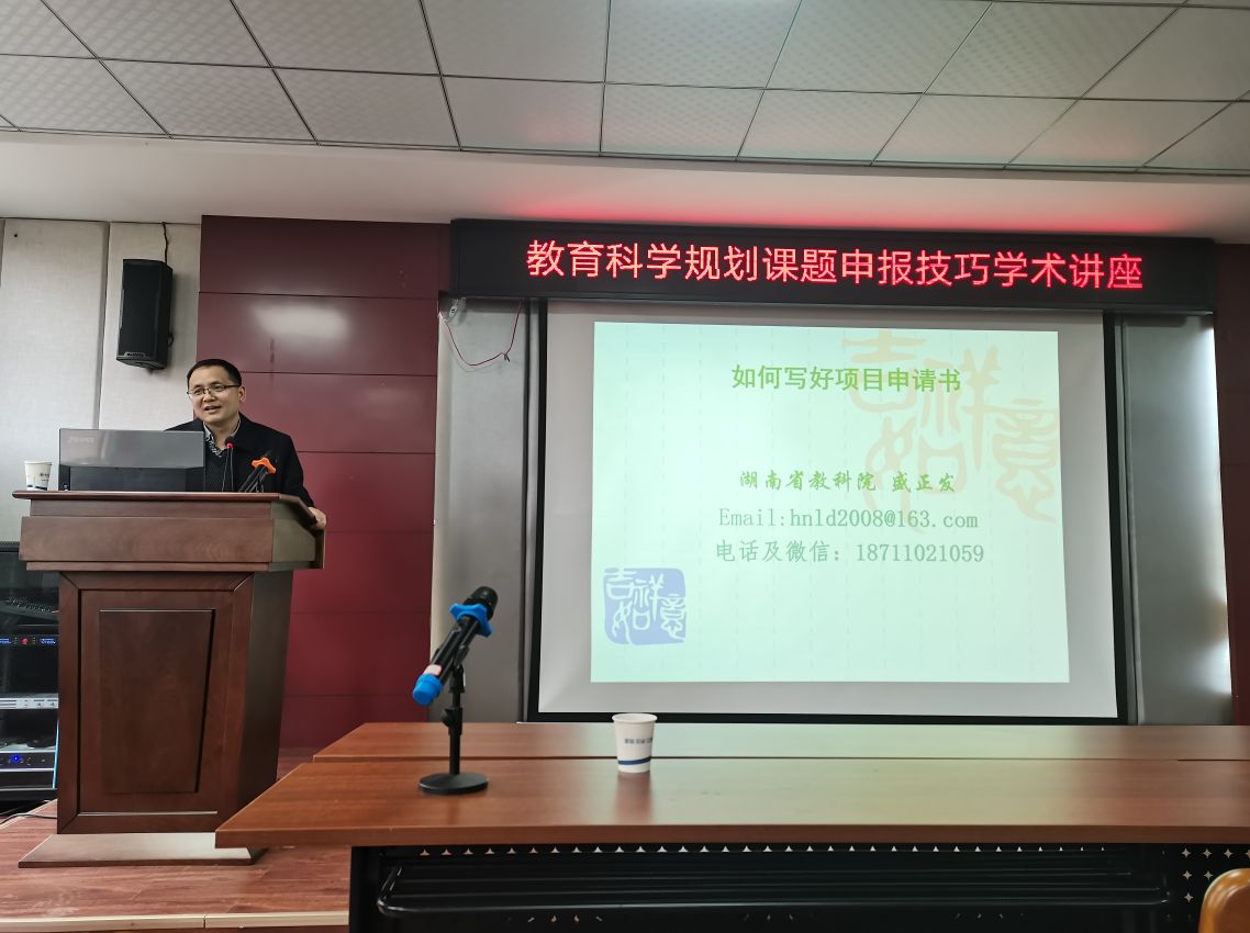 3月23日下午14:30,我院在二教201室开展了关于教育科学规划课题申报技巧学术讲座,本次讲座由湖南省教科院盛正发主讲。他针对如何写好项目申请书,更好的实现教学与科研相辅进行了心得分享,讲述了其心路历程,并且从微观角度进行了剖析。