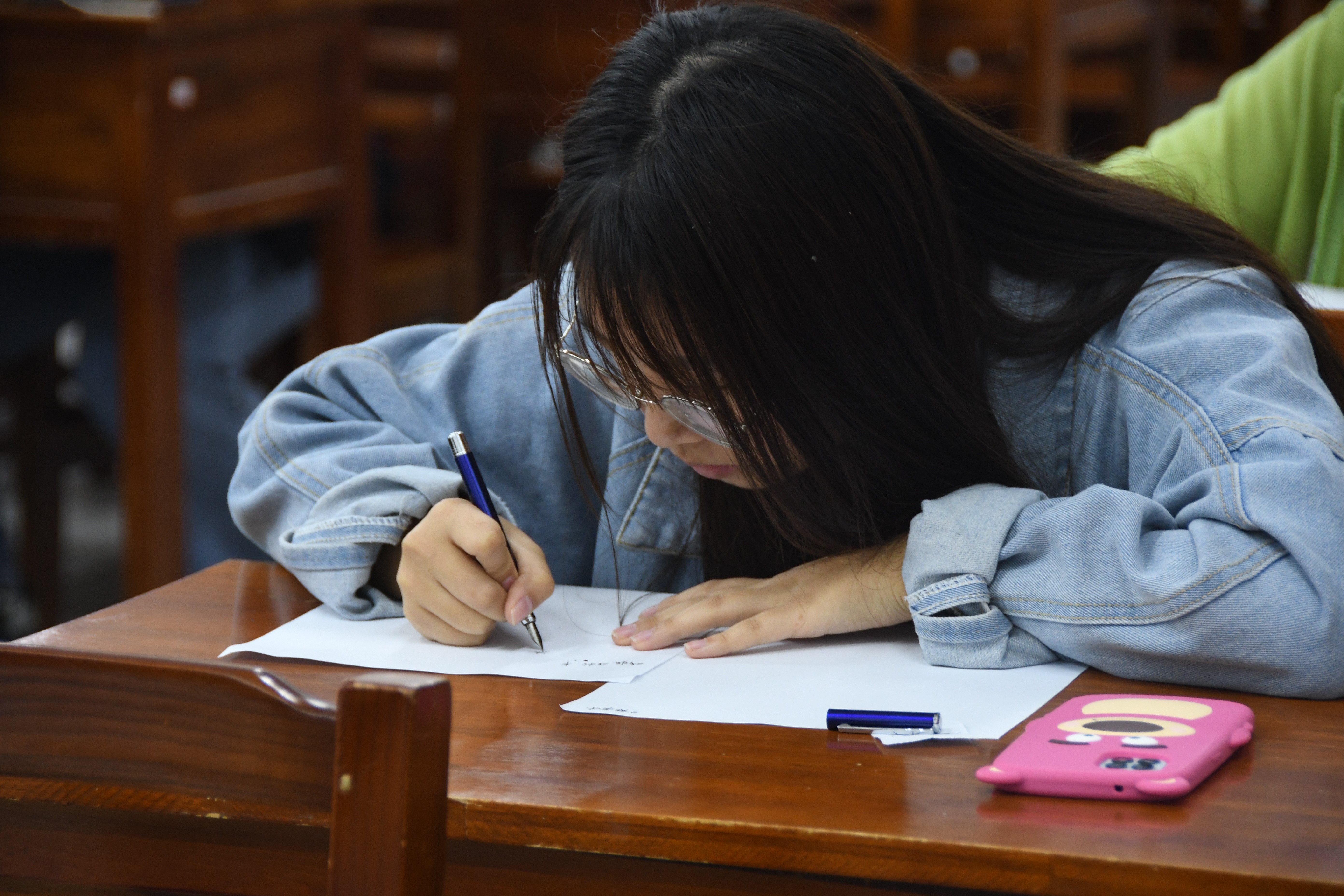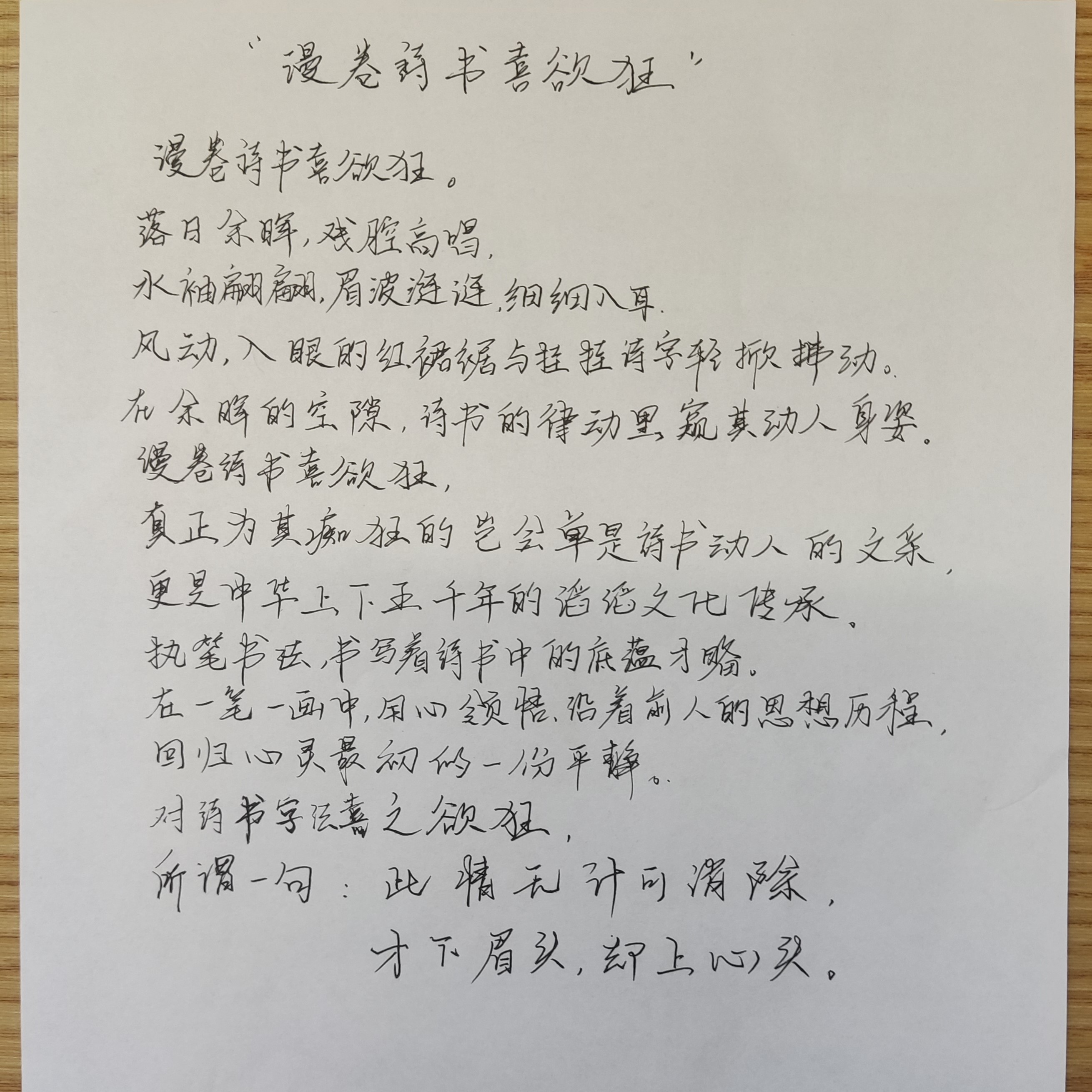 经过初赛的选拔,共有25位选手晋级决赛。12:50,选手们按照抽取的序号牌依次入座,主持人在宣读赛场秩序及比赛规则后,决赛正式开始。各选手手执钢笔书写,以“漫卷诗书喜欲狂”为主题,创作一首诗或写一段话。