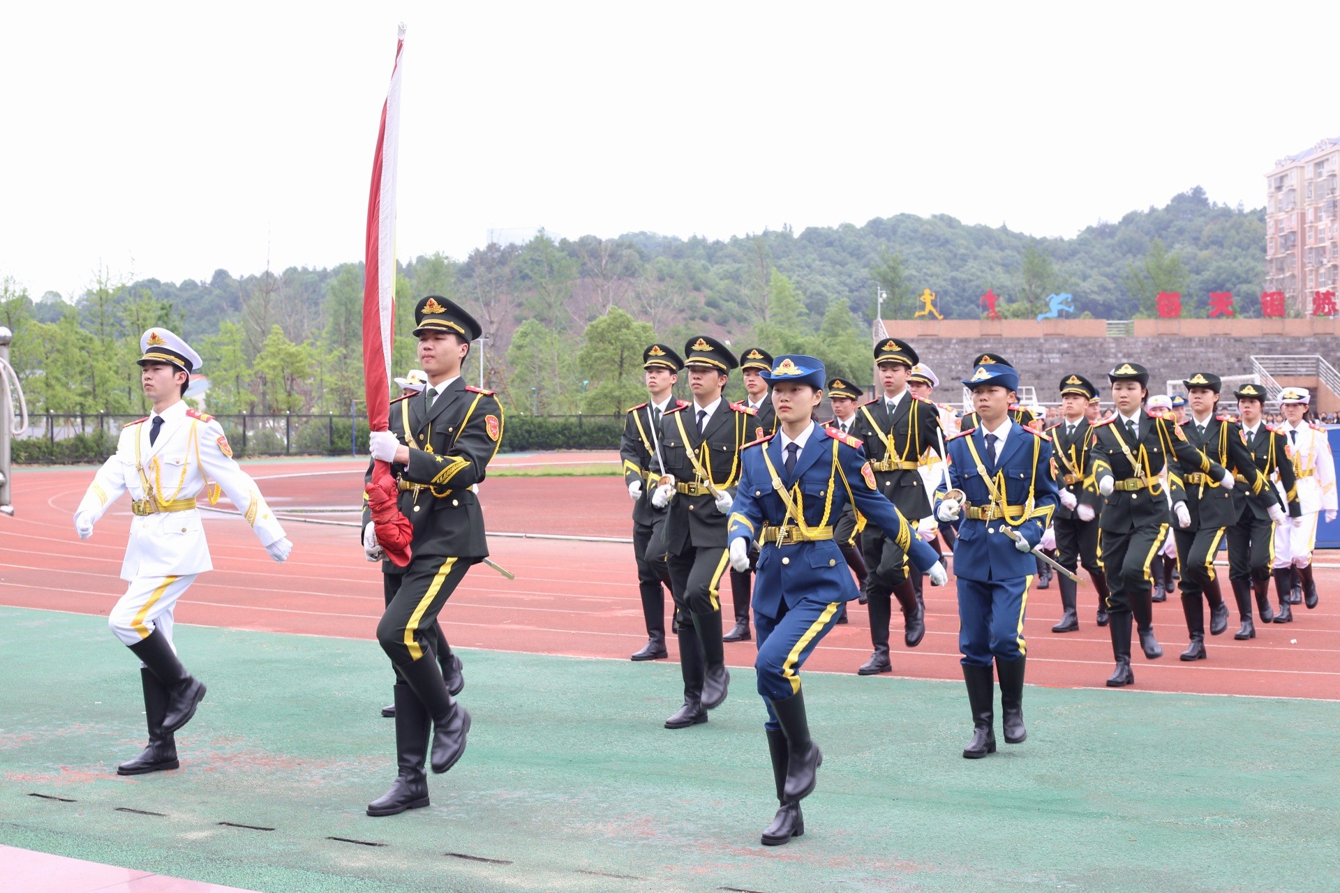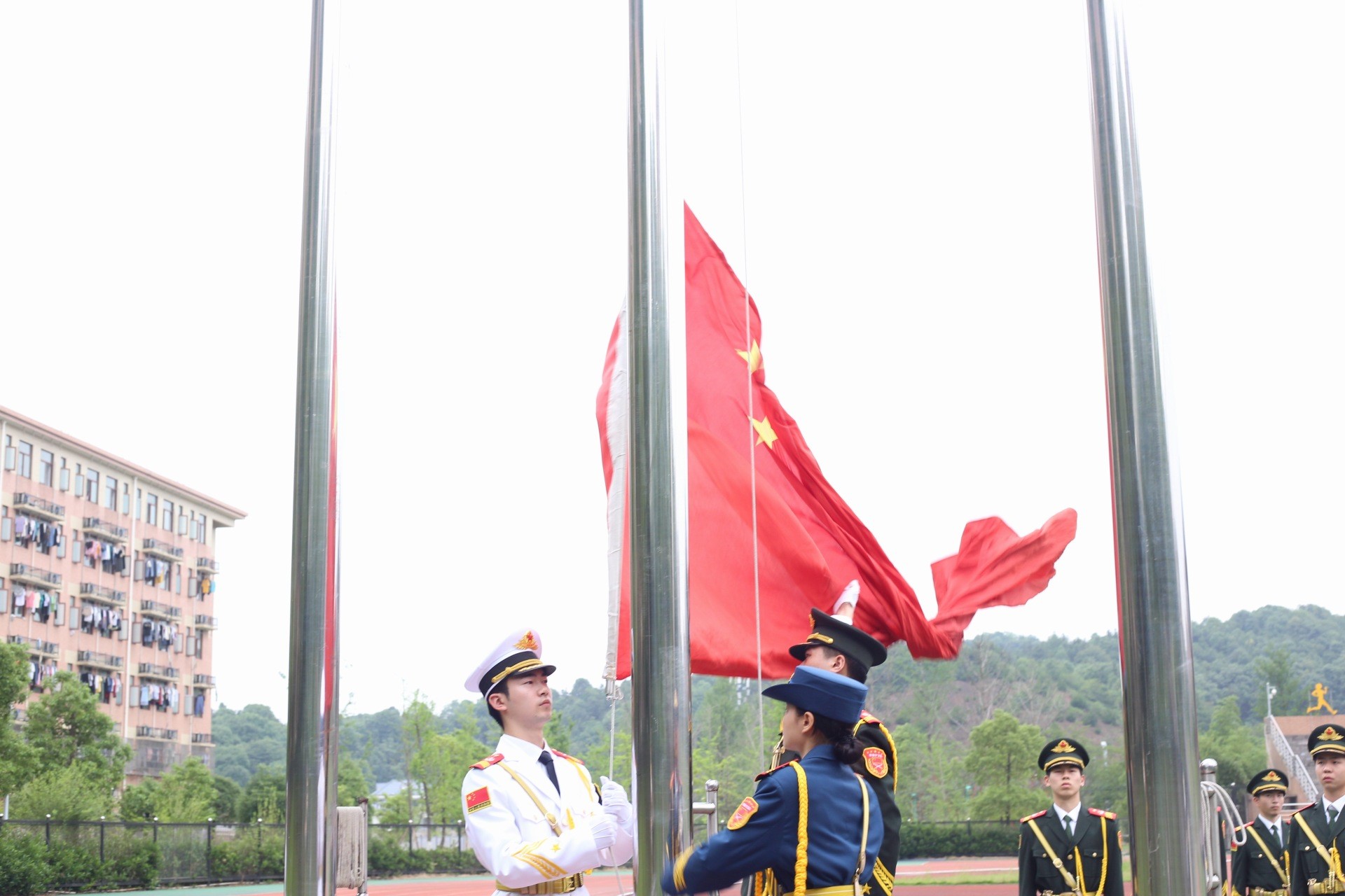 国旗护卫队迈着整齐的步伐,行至升旗台下,全体成员注视着红旗在国歌声中缓缓升起。天空中飘扬的红色,是所有同学骄傲的颜色。