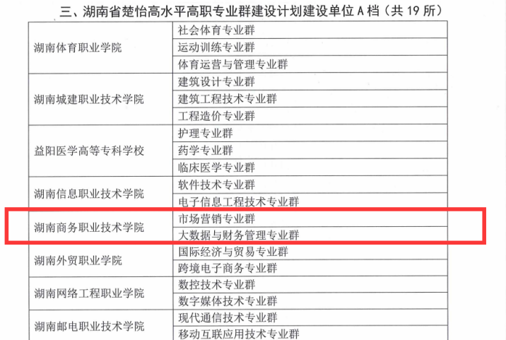 2022年7月28日,根据湖南省教育厅《关于公布湖南省楚怡高水平高职学校和专业群建设计划及楚怡优质中职学校和专业(群)建设计划建设单位名单》的通知,共19所高职院校成功立项湖南省楚怡高水平高职专业群计划建设单位A档,我校会计学院主持的大数据与财务管理专业群成功入选2022年湖南省楚怡高水平高职专业群计划建设项目。