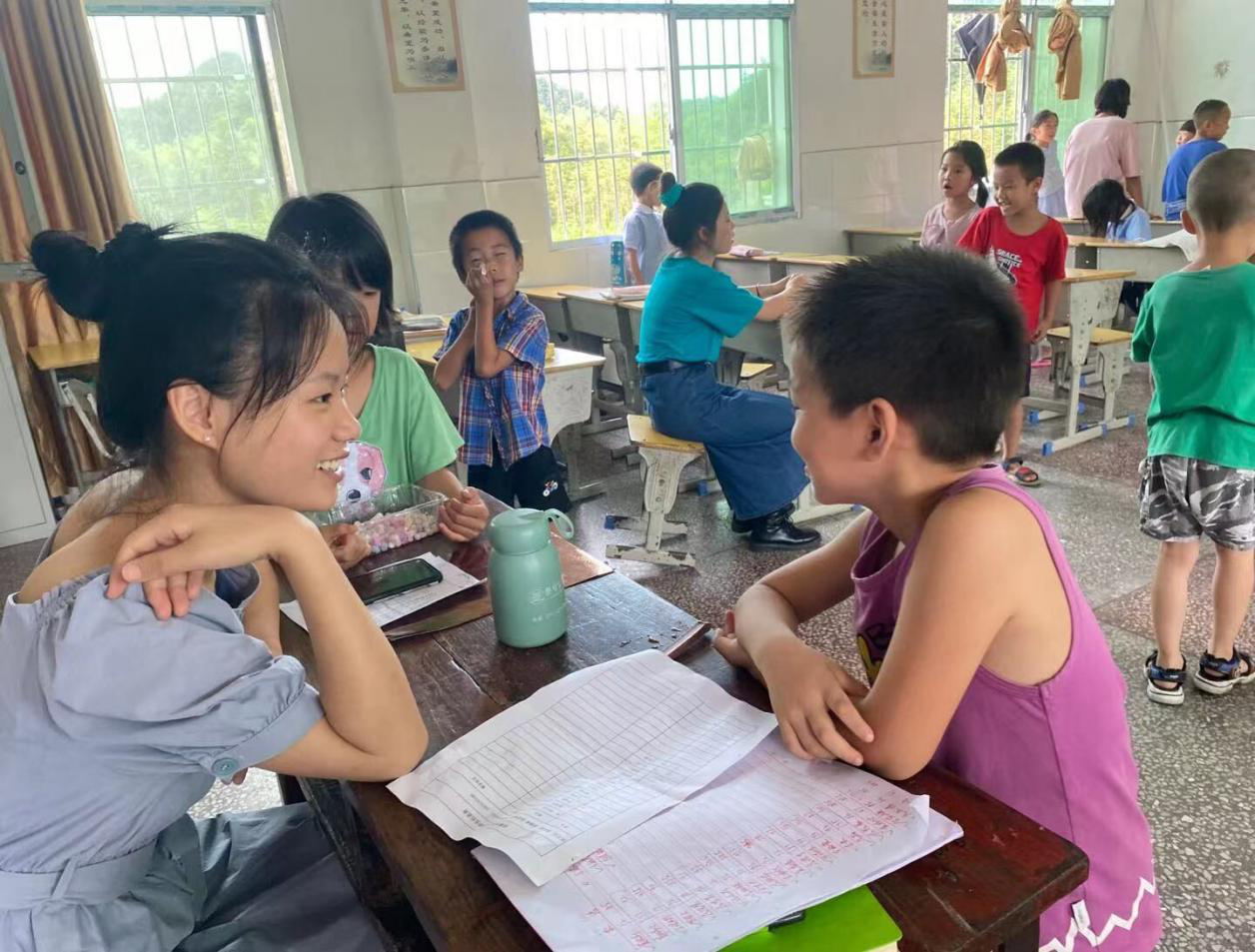 开班仪式过后,在上午的见面课堂上,孩子们积极热情、活泼可爱,纷纷争着抢着自我介绍以及表演才艺,担任低年级临时班主任的廖彩霞,耿湘紫,阳胡云,江婉情更是收到了小朋友们亲手为她们制作的特殊礼物,逗得她们哭笑不得,同时也备受感动。课堂上的有趣互动、课堂下的其乐融融,让暑假原本安静的岩坡小学“动”了起来,阵阵欢快的笑声此起彼伏,充满了整个校园。