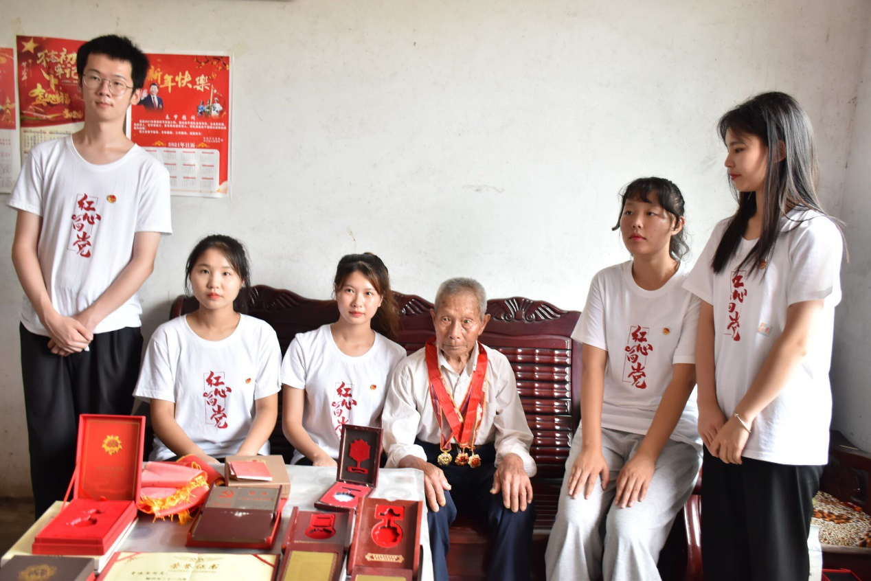 7月9日下午,团队成员拜访了今年97岁高龄的老党员曾迪南,共同聆听老人的红色故事。老人是岳阳市平江县加义镇东山村人,曾参加过解放武汉战争、解放长沙战争、抗美援朝战争。1941年,16岁的他毅然参军,1945年,光荣加入中国共产党,因身体强壮,动作敏捷,他被选为机枪手。