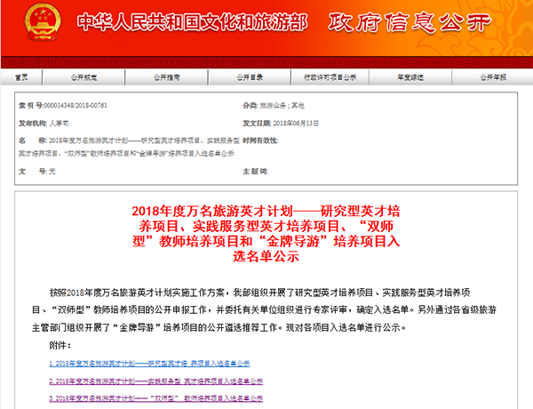 旅管学院两项项目成功入选文化和旅游部2018年度万名旅游英才计划