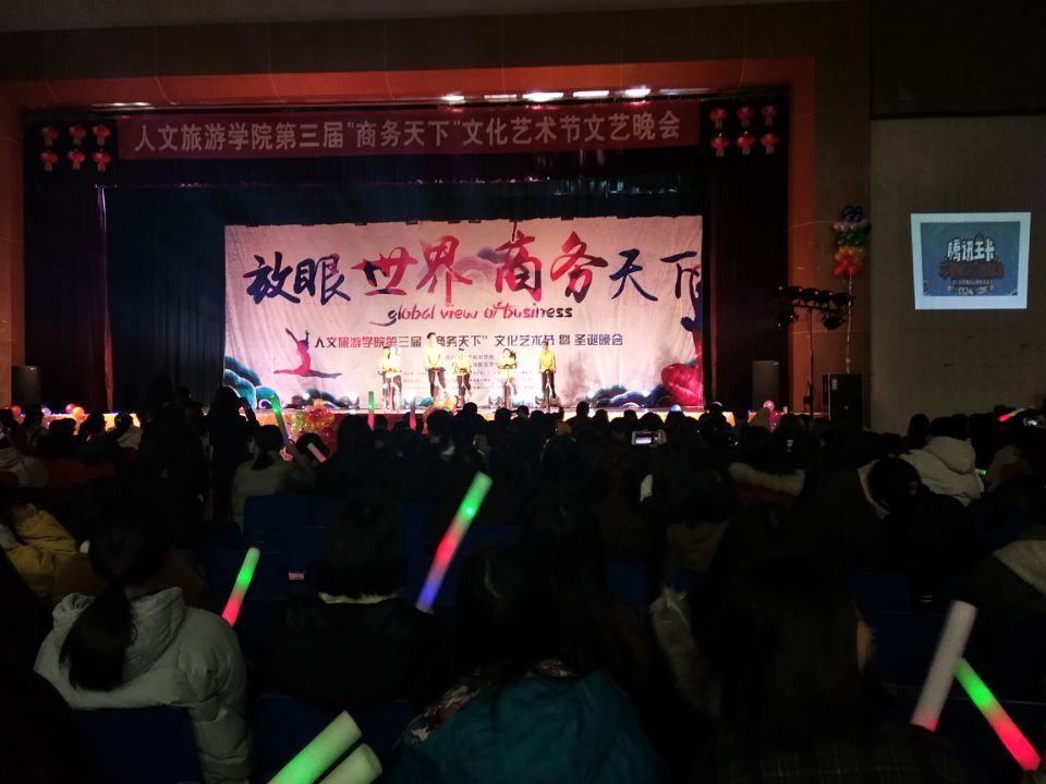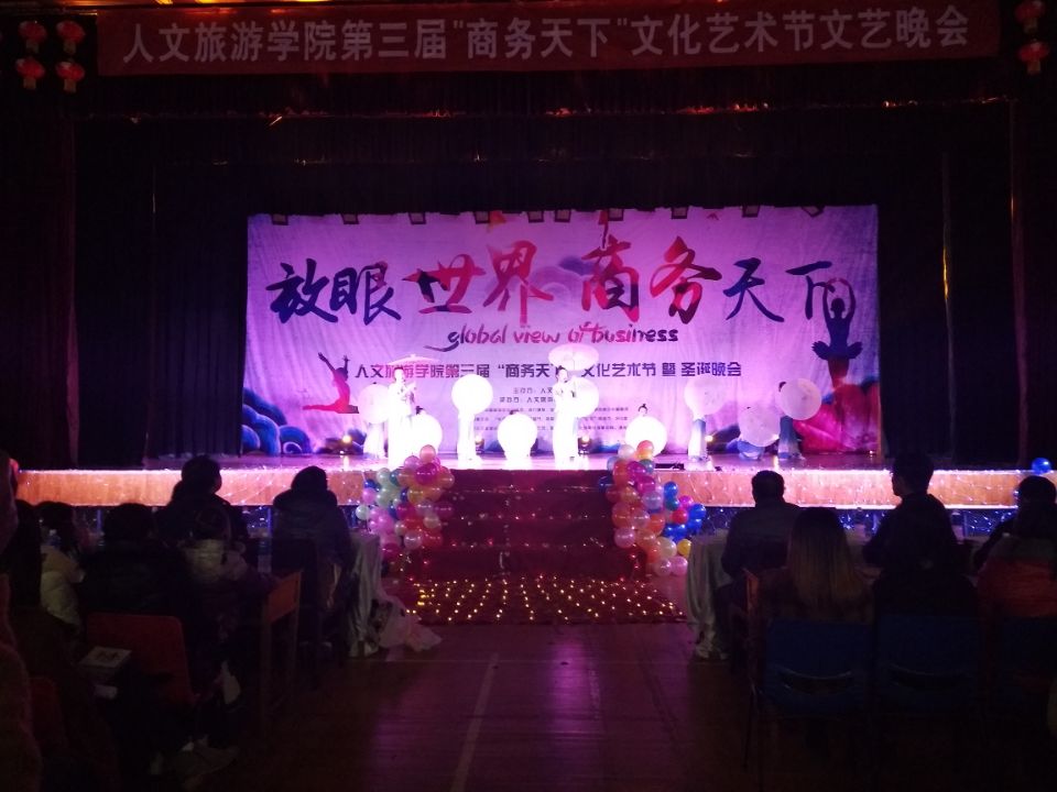 为响应十九大“新时代,新思想,新征程”的发展理念,2017年12月19日人文旅游学院"放眼世界,商务天下"文化节艺术晚会,在我校体育馆隆重举行。学院院长孔军山、副书记吕逢铬、副院长廖良林、学工处处长唐柳荷、保卫处处长周旭、人文旅游学院院长刘韵琴、副书记黄铖、副院长吴玉光、合作企业代表等莅临本场晚会,与人文学院各辅导员及老师们一同观看了这场青春盛宴。