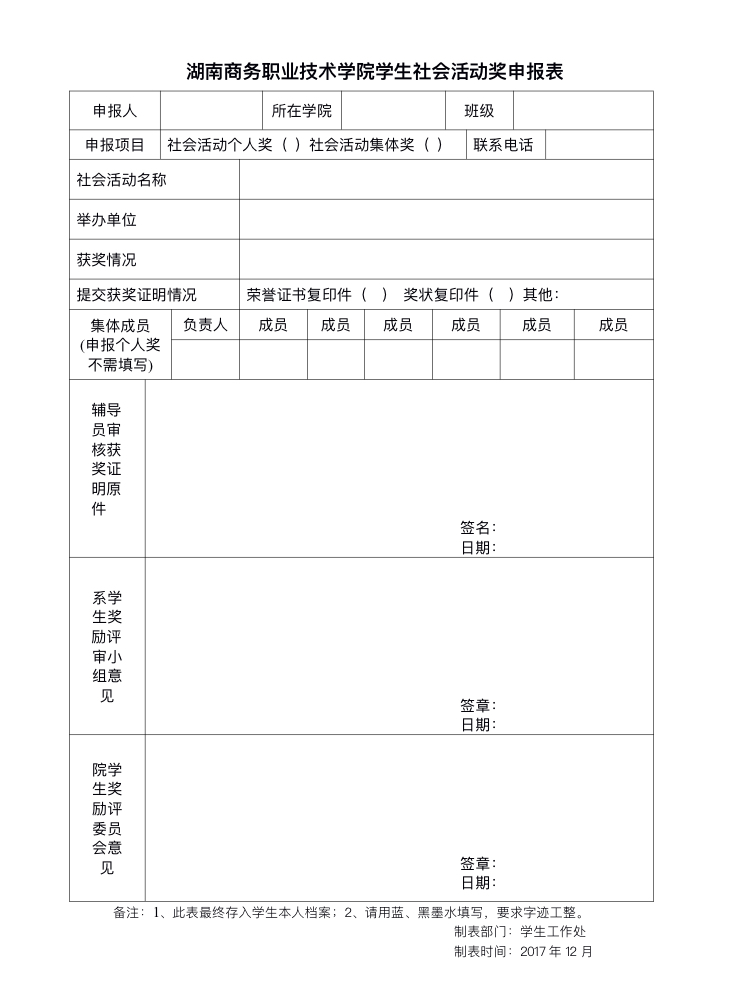 湖南商务职业技术学院学生社会活动奖申报表