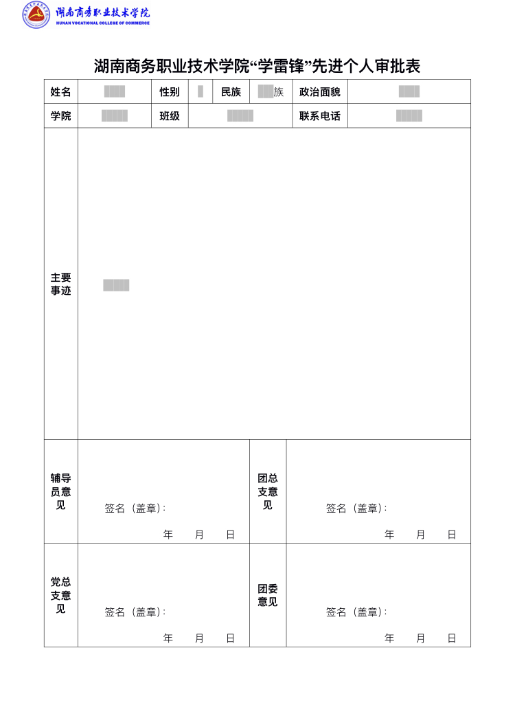 湖南商务职业技术学院“学雷锋”先进个人审批表