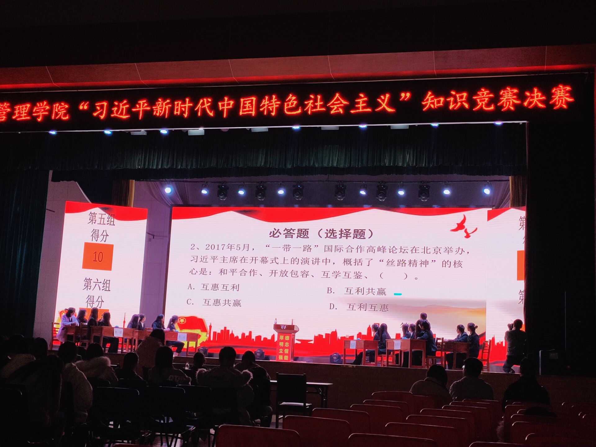 2019年12月12日晚上7时,旅游管理学院“习近平新时代中国特色社会主义思想”知识竞赛决赛于校体育馆举行。此次知识竞赛由湖南商务职业技术学院主办,旅管学院学习部,纪检部,组织部承办。本次竞赛旨在组织引导广大学生深入学习宣传贯彻习近平新时代中国特色社会主义思想和党的十九大精神,让当代大学生更加了解青年的职责。出席本次竞赛的评委为辅导员陈璐老师以及旅游管理学院团学分会主席团。
