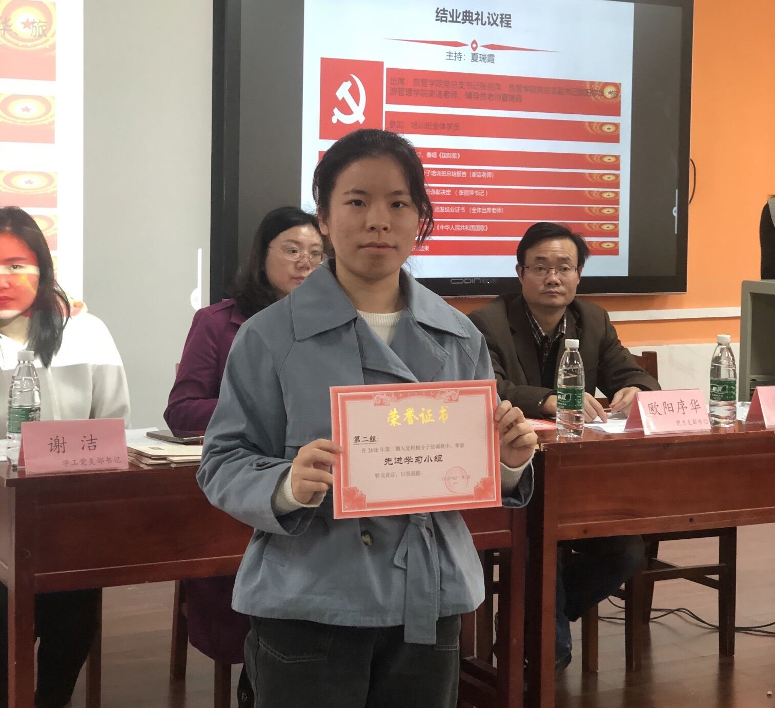 典礼共有五项议程,一是全体老师和学员起立,奏唱《国际歌》。二是谢洁老师做总结报告。谢老师指出,本期入党积极分子培训班历时二十天,经过培训、观看电影、考核讨论等各项任务,现圆满完成,45位同学都获得了结业证书。通过培训班学习,同学们对党的历史和基本知识有了比较系统的了解,政治素养得到了提高。三是张丽萍书记对先进学习小组、优秀班干部及优秀学员进行表彰。张书记向获得表彰的同学表示了祝贺,也希望他们不忘初心,再接再厉,以实际行动争取早日加入中国共产党。四是出席典礼的领导和老师为优秀学员颁奖,为全体学员颁发结业证书,并合影留念。最后,典礼在激情澎湃的《中华人民共和国国歌》中落下帷幕。