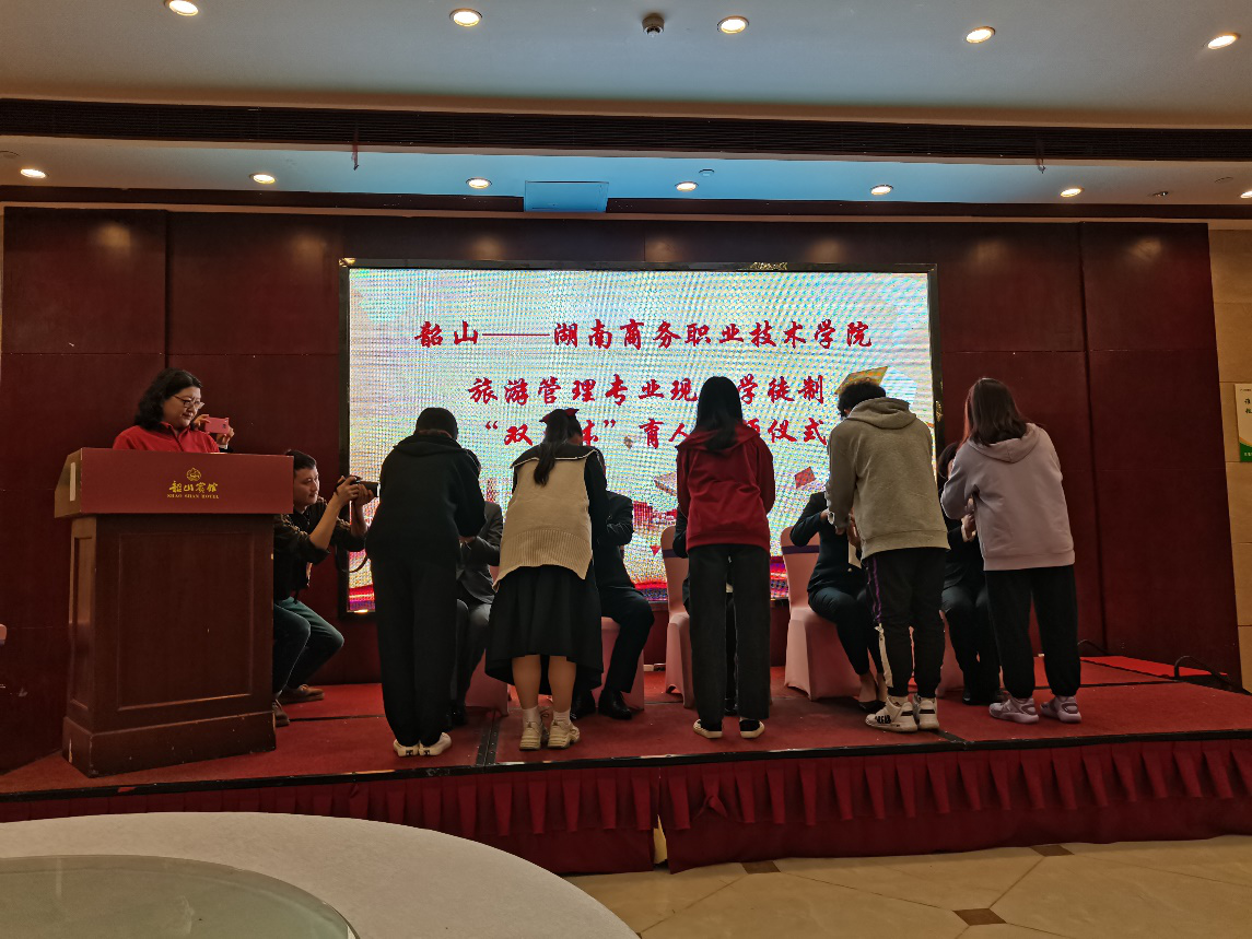 上午十时,在院长刘韵琴的主持下,在韶山宾馆举行了隆重的“拜师”仪式,韶山宾馆副总经理刘香芝、餐饮部领导谭丰、党性教育基地后勤部部长庞丹、餐饮部副经理庞欢、餐厅经理欧海艳等5位不同领域的师傅依次台上坐定,11位拜师的学生给师傅敬茶并齐声喊“师傅请喝茶”,拜师上帖。拜师结束后,我院领导与韶山国旅、韶山宾馆等合作单位进行正式的揭牌、挂牌仪式。