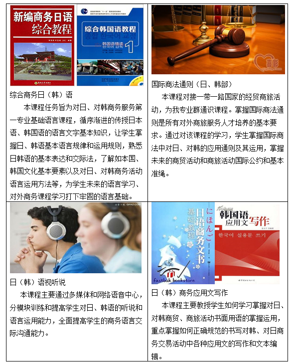 日语、韩语商务翻译;对日(韩)外经外贸工作;对日、对日(韩)商务服务与管理;对日(韩)旅游经纪人;对日(韩)国际导游;对日、对日(韩)跨境电子商务服务;对日(韩)涉外商务信息咨询与策划;对日(韩)私人高级行政助理(管家服务);对日(韩)商业株式会社经营与管理;对日(韩)商品(文化产品、工业产品、生活用品)贸易与营销;对日(韩)汉语传播与推广等岗位工作。
