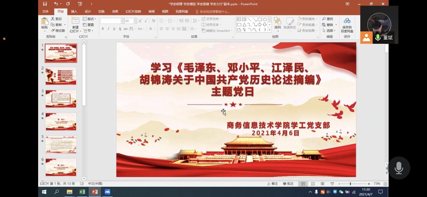 为深入学习贯彻习近平总书记在党史学习教育动员大会的重要讲话精神,进一步从党史中汲取养分,发扬红色传统、传承红色基因,激发爱国、爱党、爱人民的情怀,4月6日中午,商务信息技术学院学工党支部开展了“学习《毛泽东、邓小平、江泽民、胡锦涛关于中国共产党历史论述摘编》”主题党日活动。