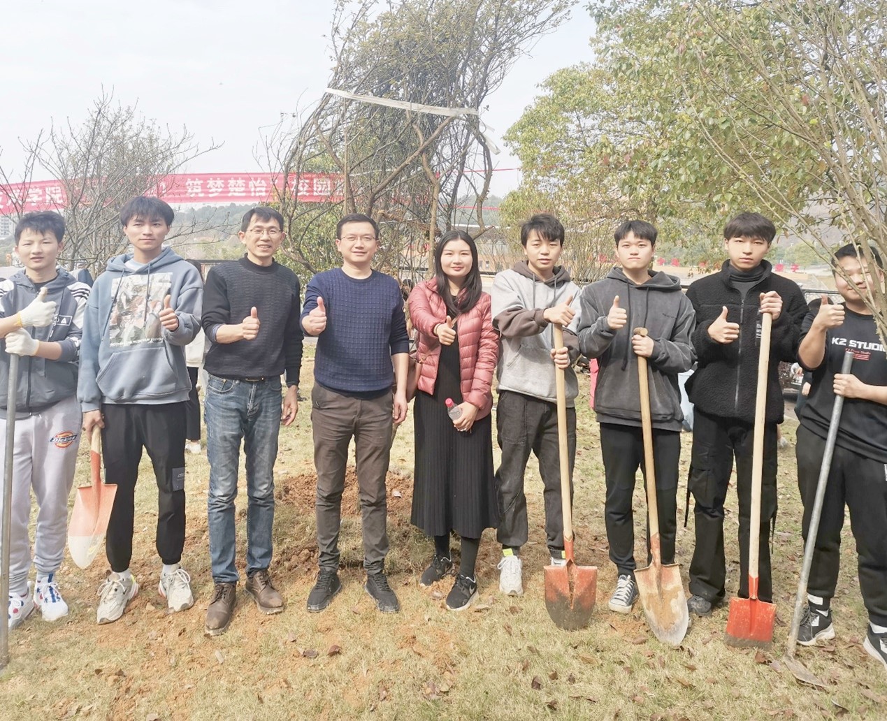 植树现场,人声鼎沸,大家纷纷拿起工具,挖坑刨土、挥锹填坑、扶树正苗、踩土压实,有条不紊地投入到植树活动中,到处洋溢着热火朝天的劳动氛围。院长皮卫也亲自上阵挖坑、栽树、填土,鼓励同学们撸起袖子加油干。学生志愿者在各个环节衔接有序,配合默契,充分发扬了“奉献、友爱、互助、进步”的志愿者精神。在大家的努力下一棵棵梅树矗立起来,田径场东侧的空地焕然一新,校园里春的气息更加浓厚。