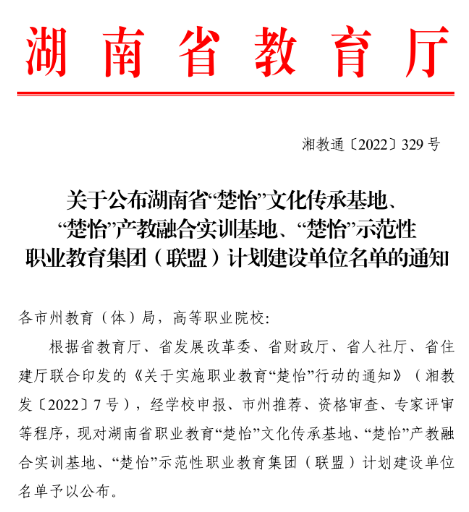 为推动职业教育与区域产业紧密对接、有效服务湖南经济社会高质量发展,湖南省教育厅、省发改委等五部门联合发布了《关于实施职业教育楚怡行动的…【查看全文】